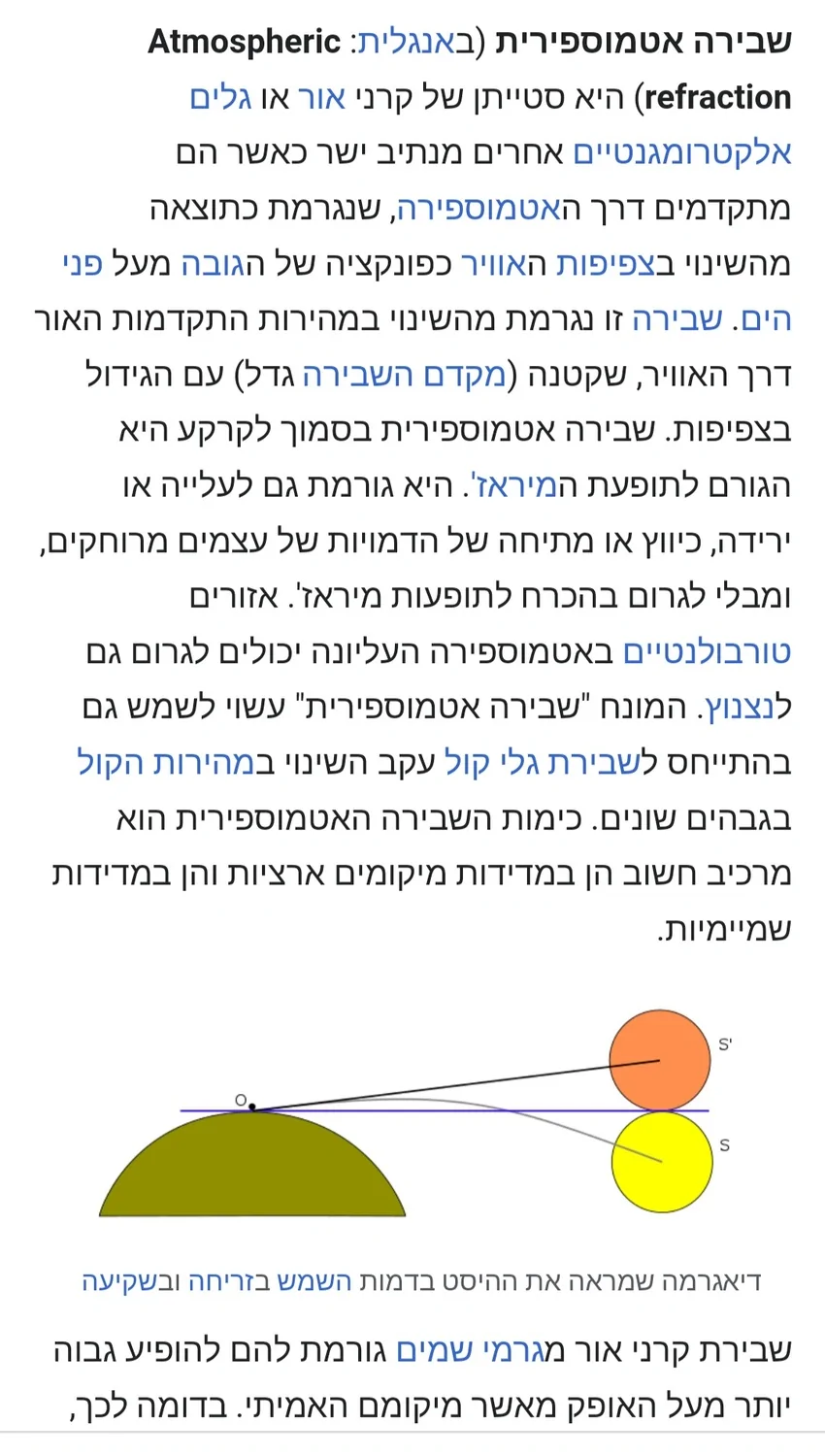 (להבהרה - נניח שבזווית 5 מעלות אנחנו רואים אותה במיקום האמיתי, כשאנחנו רואים אותה בזווית 0, היא בעצם נמצאת מתחת לאופק, אז בזמן שאנחנו רואים אותה עולה 5 מעלות, היא עושה מקטע גדול יותר)