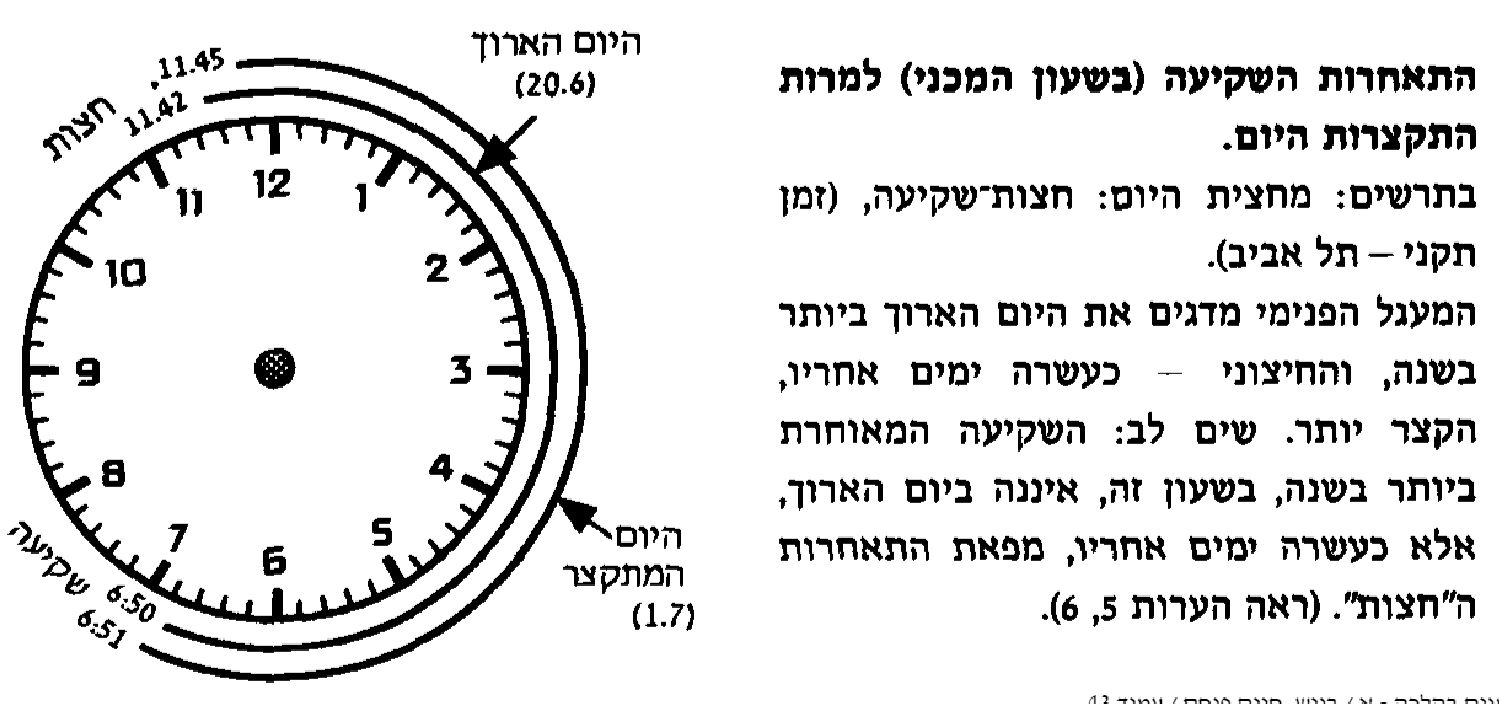 לפי מבנה השעון שלנו- שעת חצות היום היא ב- 12:00 בצהריים. וממילא, כאשר השקיעה מתאחרת לפי השעון שלנו, נוצר אצלינו רושם כאילו גם במציאות השקיעה מתאחרת, ומאידך גיסא כאשר הזריחה נהיית מוקדמת יותר לפי השעון שלנו, נוצר אצלינו רושם כאילו גם במציאות הזריחה נהיית מוקדמת יותר, כאשר בשני המיקרים יכול להיות שמדובר בטעות אופטית, ובמציאות המצב הפוך.