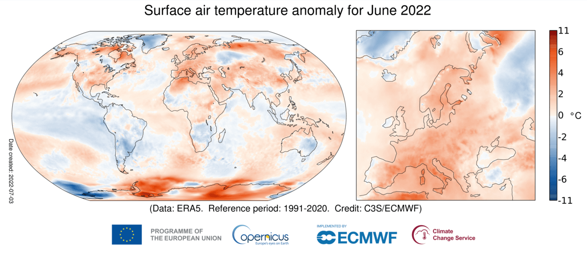 לפי קופרניקוס, אנומליית הטמפרטורות של חודש יוני 2022 בעולם הייתה חמה ב- 0.31°C מעל הממוצע של השנים 1991-2020 והוא דורג במקום ה-3 בין חודשי יוני החמים ביותר.
