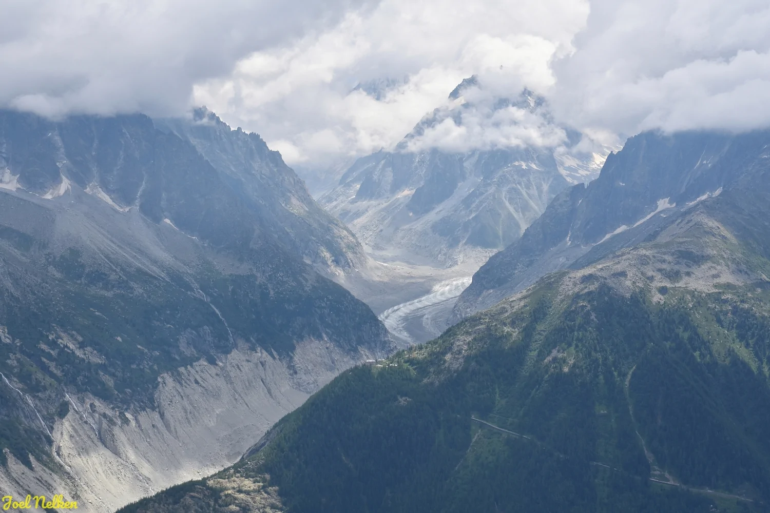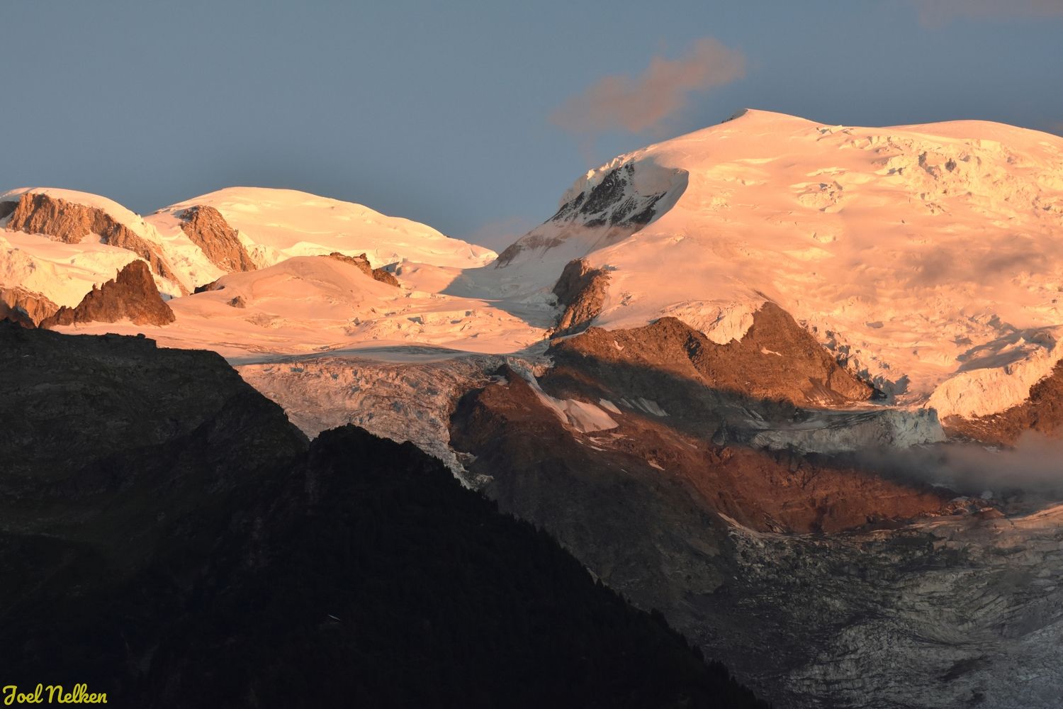רכס המון בלאן והקרחונים היוצאים מהפסגות נגלו לנגד עינינו.