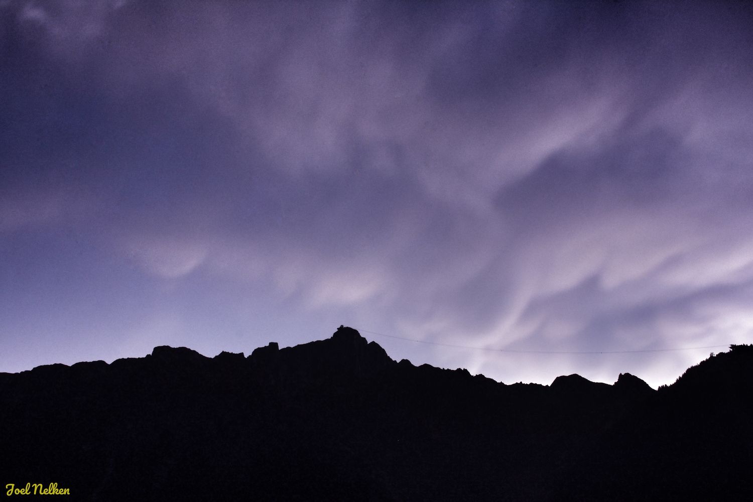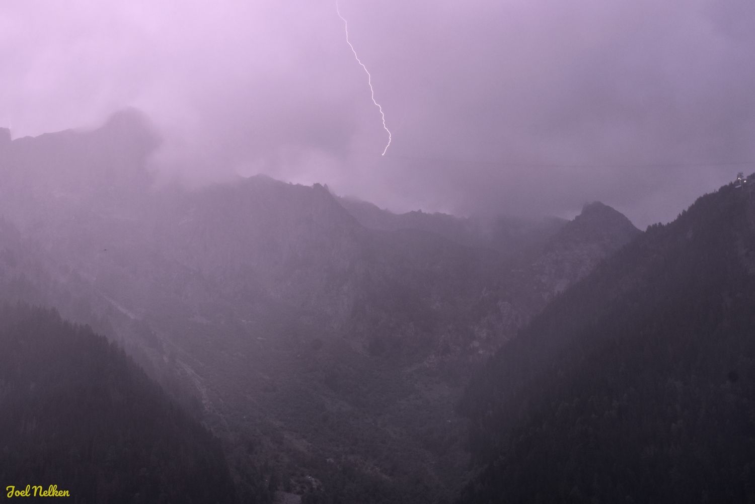 בתמונה השנייה ניתן לראות שאחד הברקים פגע באחד הכבלים של הרכבל שמגיע לאחת הפסגות שהייתי בהן רק יום קודם. צולם בשעות הבוקר המוקדמות.