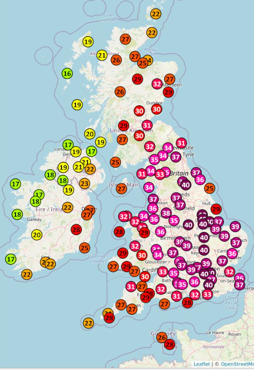 ולכן אני מצפה שהשיא היומי יגיע מאוחר יחסית. התחנה שמדדה אתמול את ה40.3 עשתה זאת אחרי השעה 15:00, שאפילו זה נשמע לי מוקדם. בכל אופן, השיא הארצי לא נמדד בתחנות הכי חמות. היו הרבה דיוחיים על תחנות לא רישמיות שמדדו 41 ואפילו 42 מעלות. די הזוי שהיו כל כך הרבה תחנות רישמיות שמדדו מעל 39.8, אך השיא הוא רק 40.3. חלק מהתחנות ממוקמות במרחק של מאות קילומטרים אחת מהשנייה. הקהילה החובבנית בבריטניה די כועסת על החוסר פיזור ומגוון של התחנות הרישמיות.