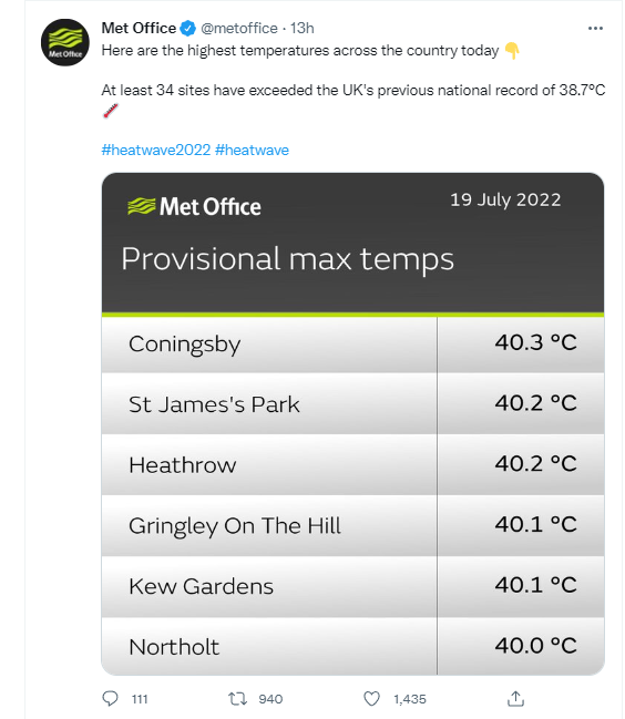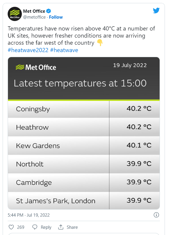 השיא הלאומי החדש של בריטניה - כ-40.2°C בנמל התעופה הית'רו שבלונדון. נמדד סביב השעה 12:50 היום, 19 ביולי 2022