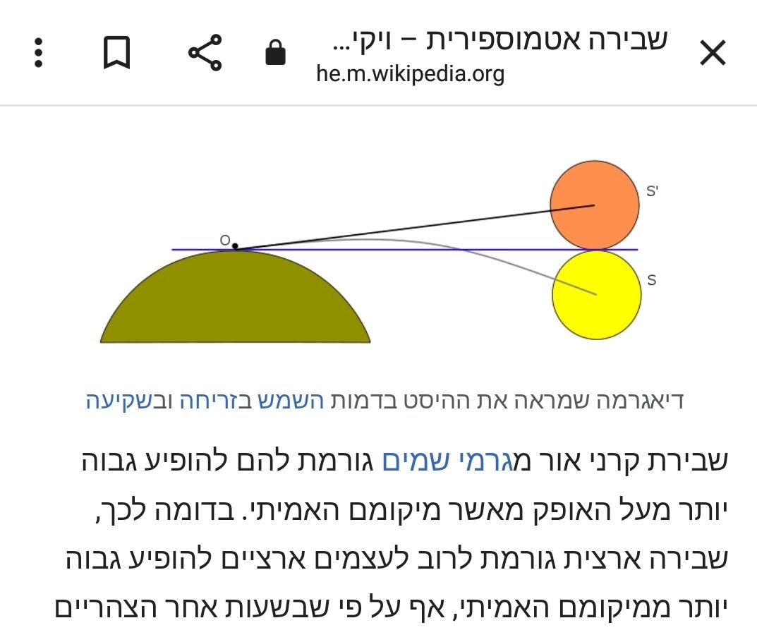 שבירת קרני השמש באטמוספירה גורמת לה להראות מעל האופק קצת לפני הזריחה ה"אמיתית" שלה וקצת אחרי השקיעה.