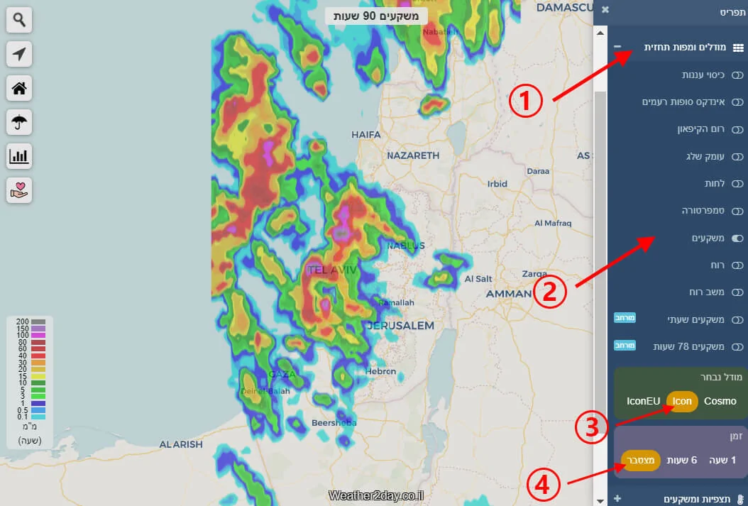 לאחר בחירה של הפרמטר הרצוי (למשל משקעים) יפתח תפריט המודל לבחירה, מהירה וזמן (למשל מצטבר או שעתי).