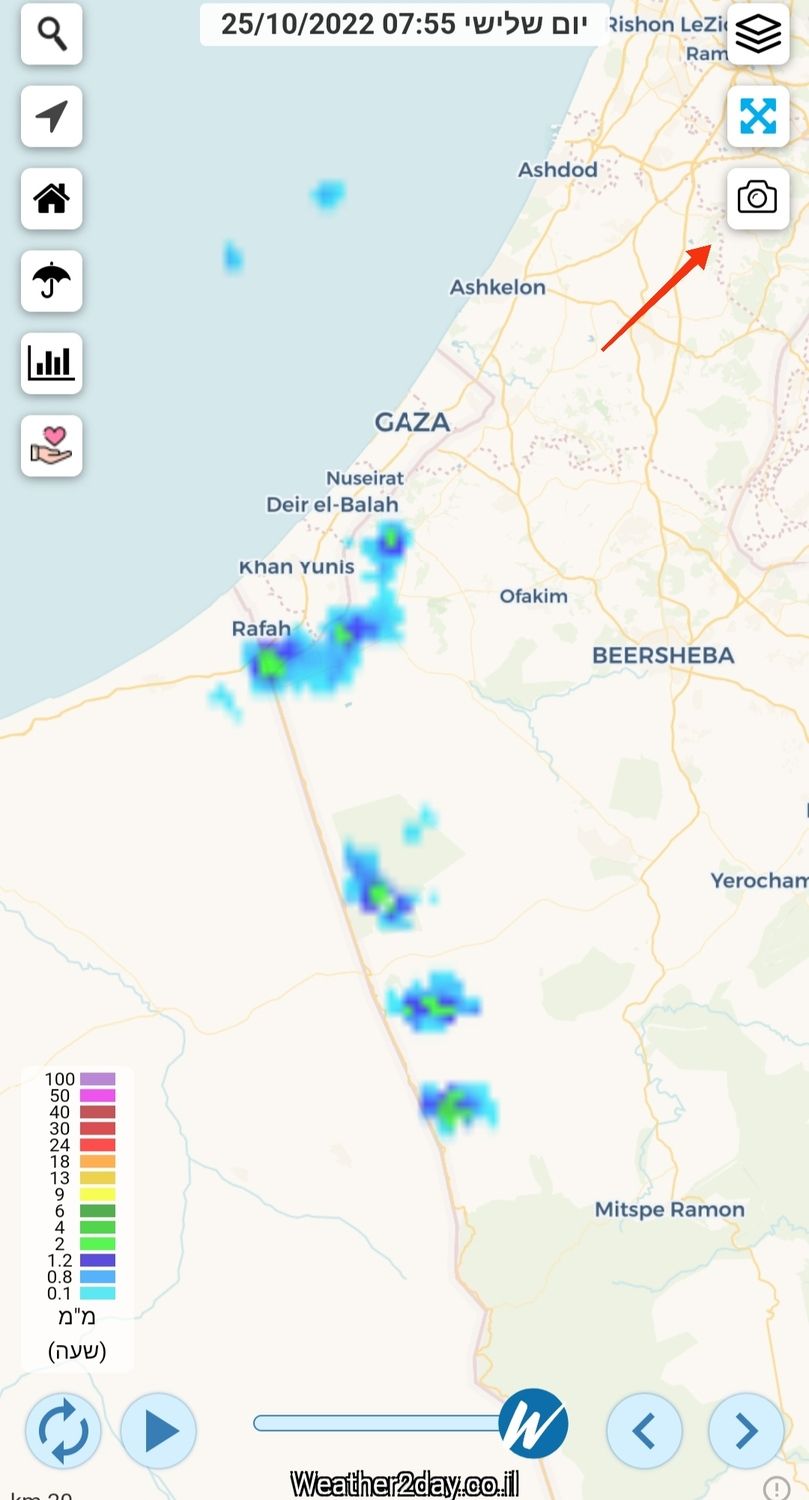 - ניתן להשתמש באופצית צילום המסך לצילום תמונה עדכנית של ענני הגשם Weather2day