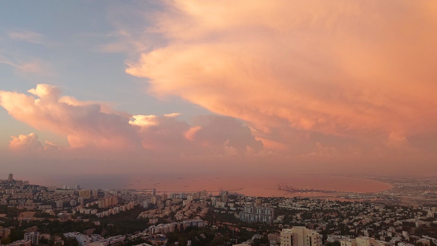 - מופע עננים לקראת שקיעה מעל מפרץ חיפה מונט