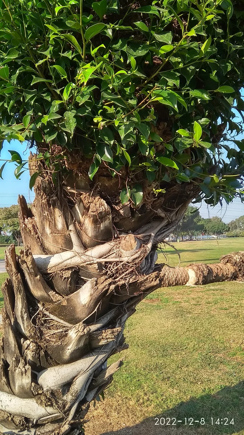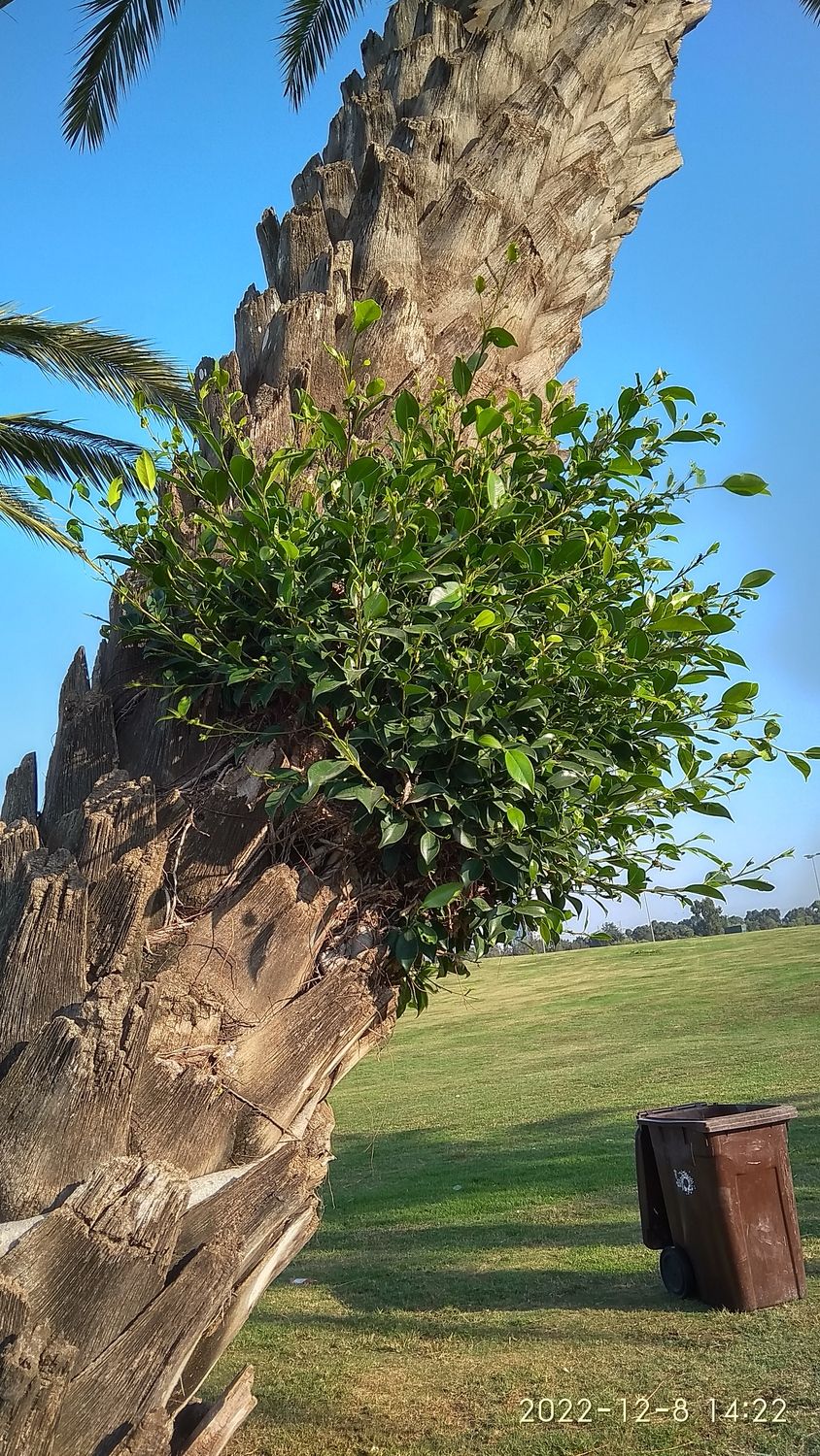 כשהתקרבתי לדקל נפתרה התעלומה. מסתבר שעץ פיקוס שעומד במרחק של כמה מטרים משם שלח שורש ארוך עד לעץ הדקל שהתחיל להתפתל סביב הגזע, ובקצהו הוציא השורש את השיח על גבי הדקל ! מדהים !