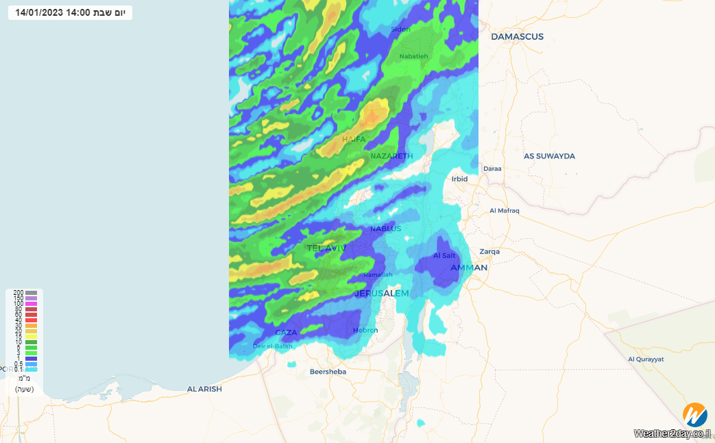 להלן צפי כמויות המשקעים ממודל איקון ל-12 שעות הבאות החל מהשעה 14:00 היום ועד לשעה 14:00 ביום ראשון. כמויות חזויות ל-24 שעות הקרובות בין 50 - 75 מ"מ. התראת הצפות של השירות המטאורולוגי בתוקף.