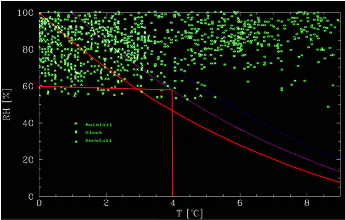 בתמונה מספר 3 אני מציג את מחקר יפני שמראה את סוג המשקע כפונקציה של הטמפרטורה ואחוז הלחות באוויר. 4 מעלות עם 60% לחות יושב בדיוק על הקו הסגול. הקו הסגול מפריד בין "לרוב יורד כגשם" ל"לרוב יורד כשלג".