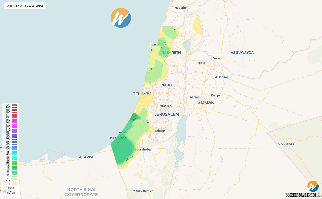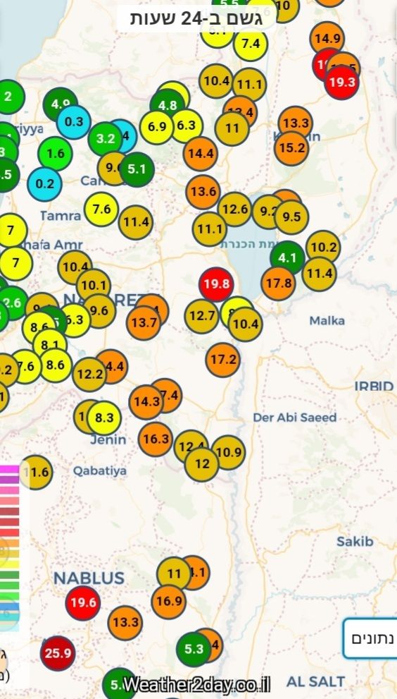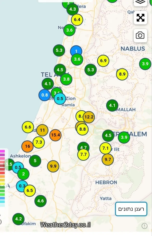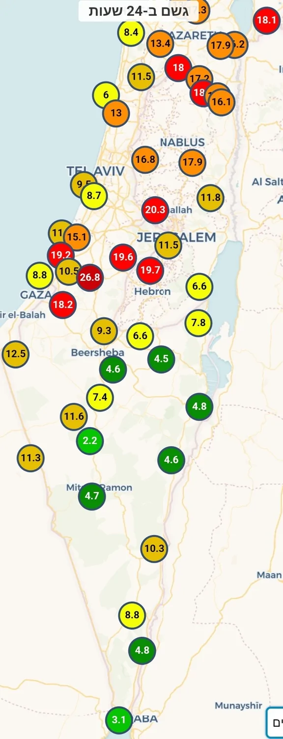 לצערי כאן אחד המקומות היבשים בכל הארץ (רק 13 ממ)... רוב המקומות מסומנים עברו את 20 ה ממ וחלקם את ה 30 ממ כפי שנראה במפת משקעים כעת