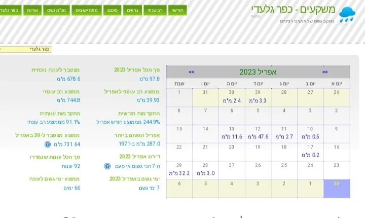 - כפר גלעדי: למערכת - 38 ממ, אפריל - 105 ממ, לעונה - 697 ממ, 93% מהממוצע חנוך א
