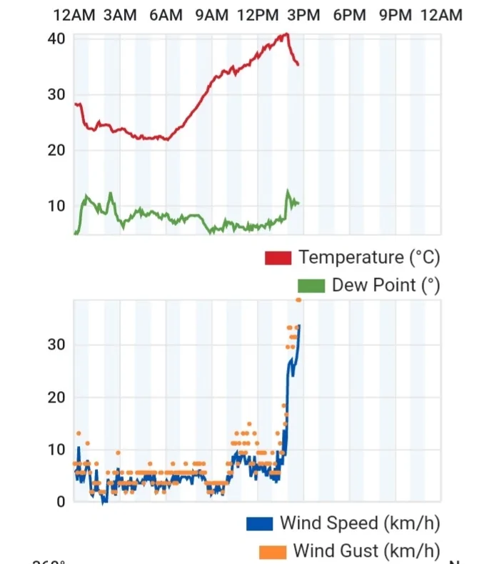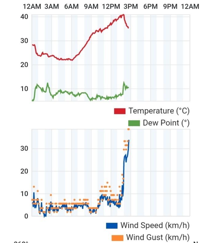 הצפי כאן הוא ל 37-38 מעלות עד שעה 13 ואז ירידת הטמפרטורות בהדרגה (שבירת שרב ?)