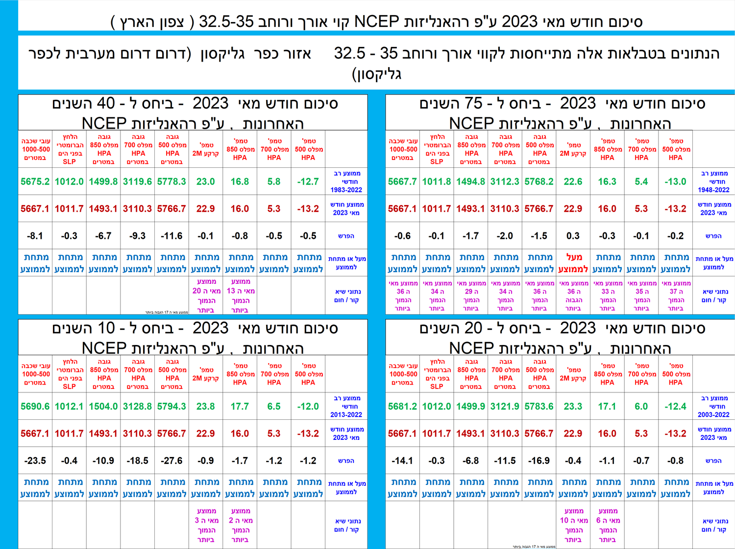 הממוצע בגובה 2 מטר מעל הקרקע בחודש מאי ביחס ל 40 השנים האחרונות הסתיים כ - קר מהרגיל במעט, ב – 0.1 מ"צ מתחת לממוצע. ( וביחס ל – 40 השנים האחרונות זהו הממוצע ה- 20 הנמוך ביותר) במפלס 850 מ"ב ( גובה ממוצע 1500 מטר מעל הקרקע) חודש מאי הסתיים כ - קר מהרגיל, ב - 0.8 מ"צ מתחת לממוצע. ( וביחס ל – 40 השנים האחרונות זהו הממוצע ה- 13 הנמוך ביותר) . במפלס 700 מ"ב (גובה ממוצע 3000 מטר מעל הקרקע) חודש מאי הסתיים כ – קר מהרגיל , ב - 0.5 מ"צ מתחת לממוצע. במפלס 500 מ"ב ( גובה ממוצע 5500 מטר מעל הקרקע ) חודש מאי הסתיים כ – קר מהרגיל, ב - 0.5 מ"צ מתחת לממוצע.
