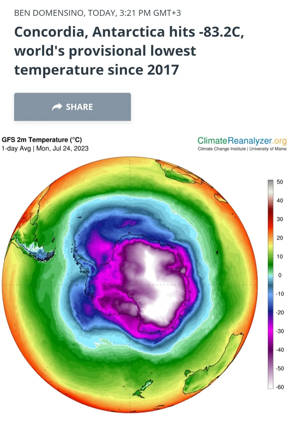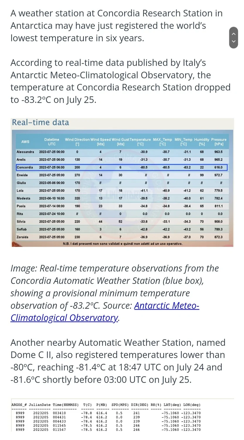 שיא 6 שנתי לטמפרטורת מינימום איזורי נמדד בתחנת קונקורדיה באנטרקטיקה