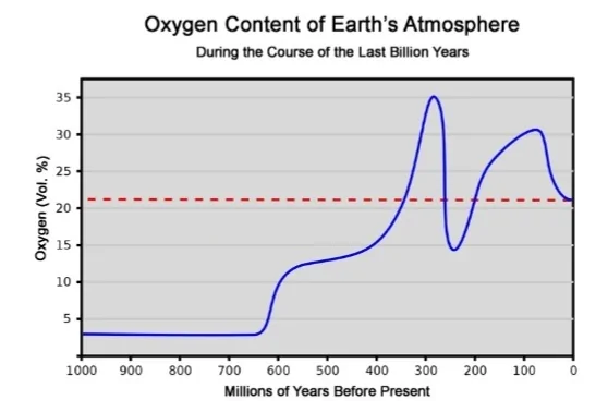 גרף ריכוז החמצן באטמוספירה במיליארד השנים האחרונות