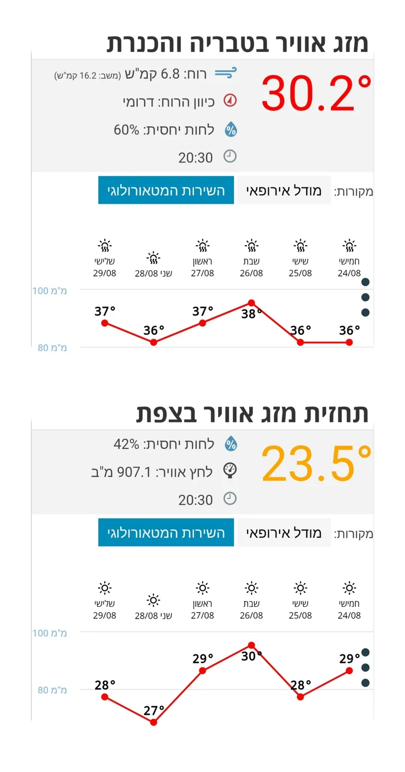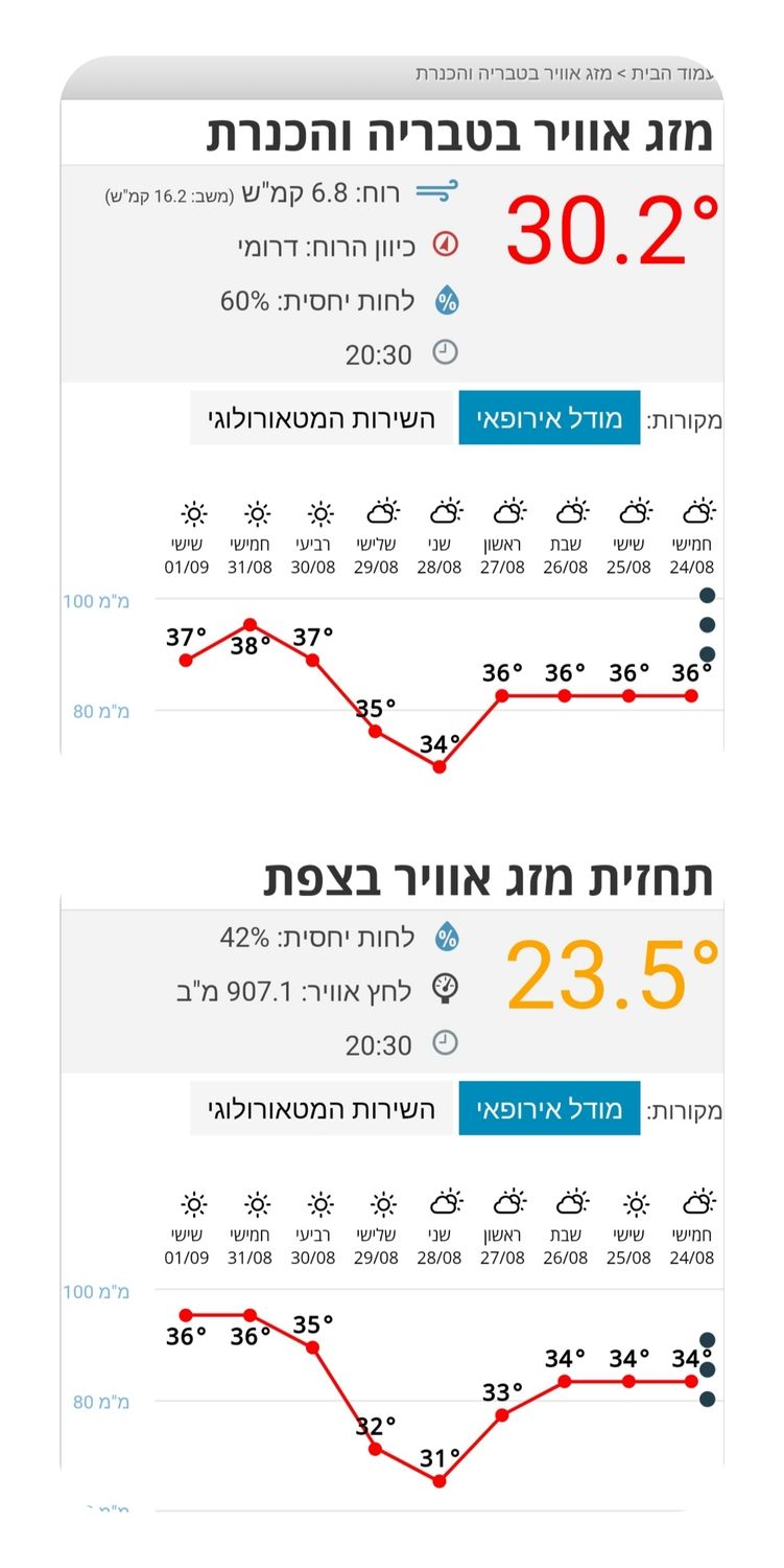 לפי התחזיות שהמודל האירופאי נותן בשבועות האחרונים הדבר לא רחוק ! נתוני תחזית טמפרטורה מאוד גבוהים לפי המודל בצפת, כאשר המרחק בין נתוני טבריה הלוהטת לנתוני צפת הם הפרש של בין 1-3 מעלות בלבד ! מדהים לראות שתחזית הטמפרטורה לאחד המקומות היותר קרירים בארץ והתחזית לאחד המקומות היותר חמים בארץ כמעט שוים. ניתוק קיצוני מהמציאות.