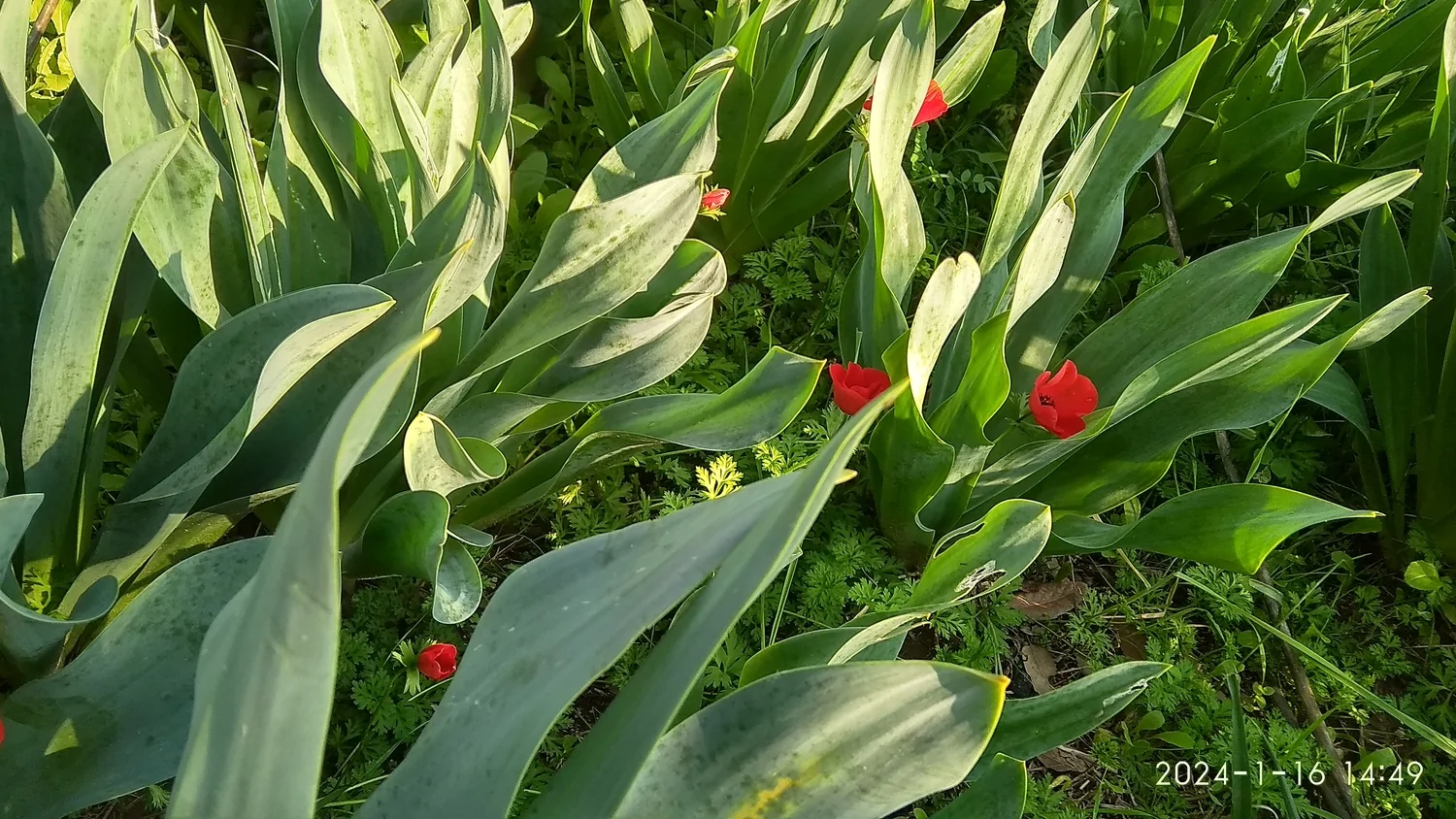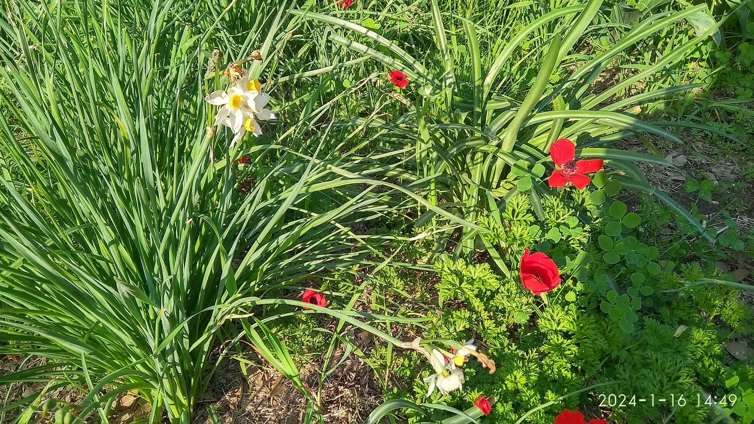 פריחה משולבת של נרקיסים וכלניות, כאשר הנרקיסים נמצאים בשלב הסופי של הפריחה, ואילו הכלניות נמצאות כעת בשיא פריחתן.