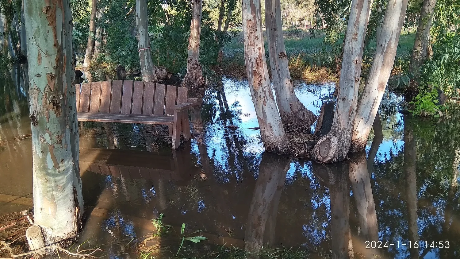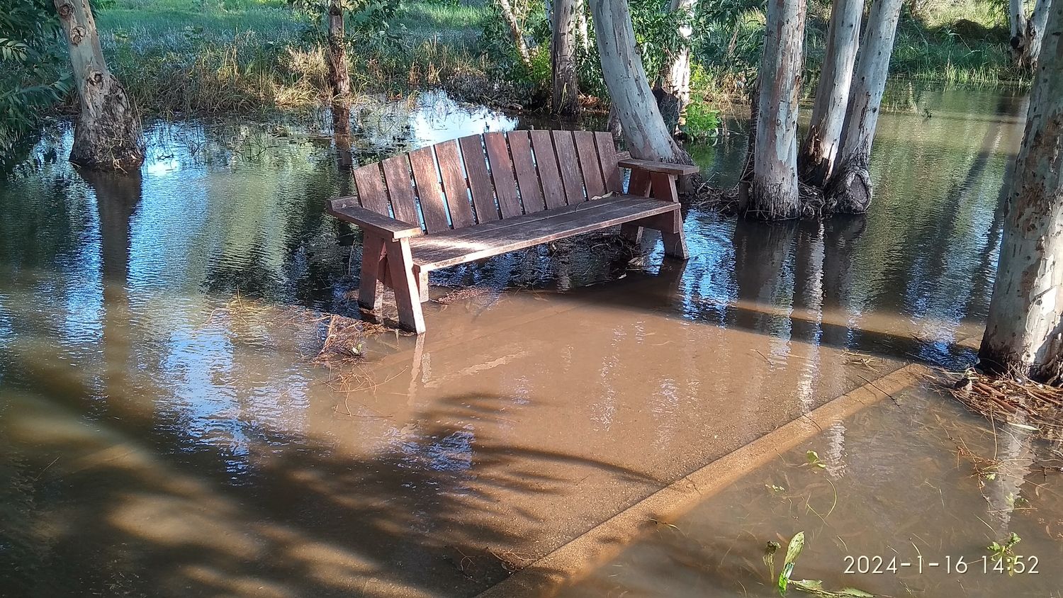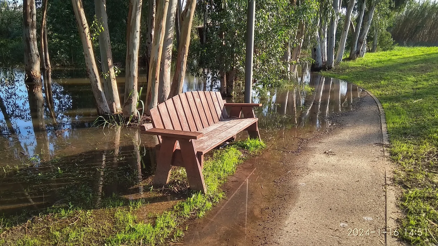 שבילי הליכה בפארק הרצליה שמוצפים במים וספסלים בפארק שתקועים בתוככי השטח המוצף.