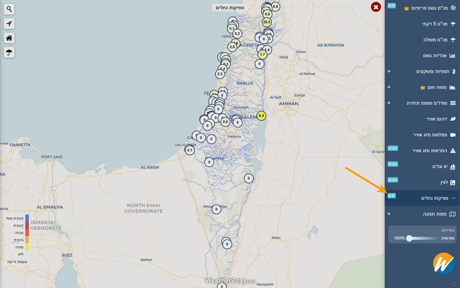 - חדש: נתוני ספיקות נחלים על גבי מפת מזג האוויר Weather2day