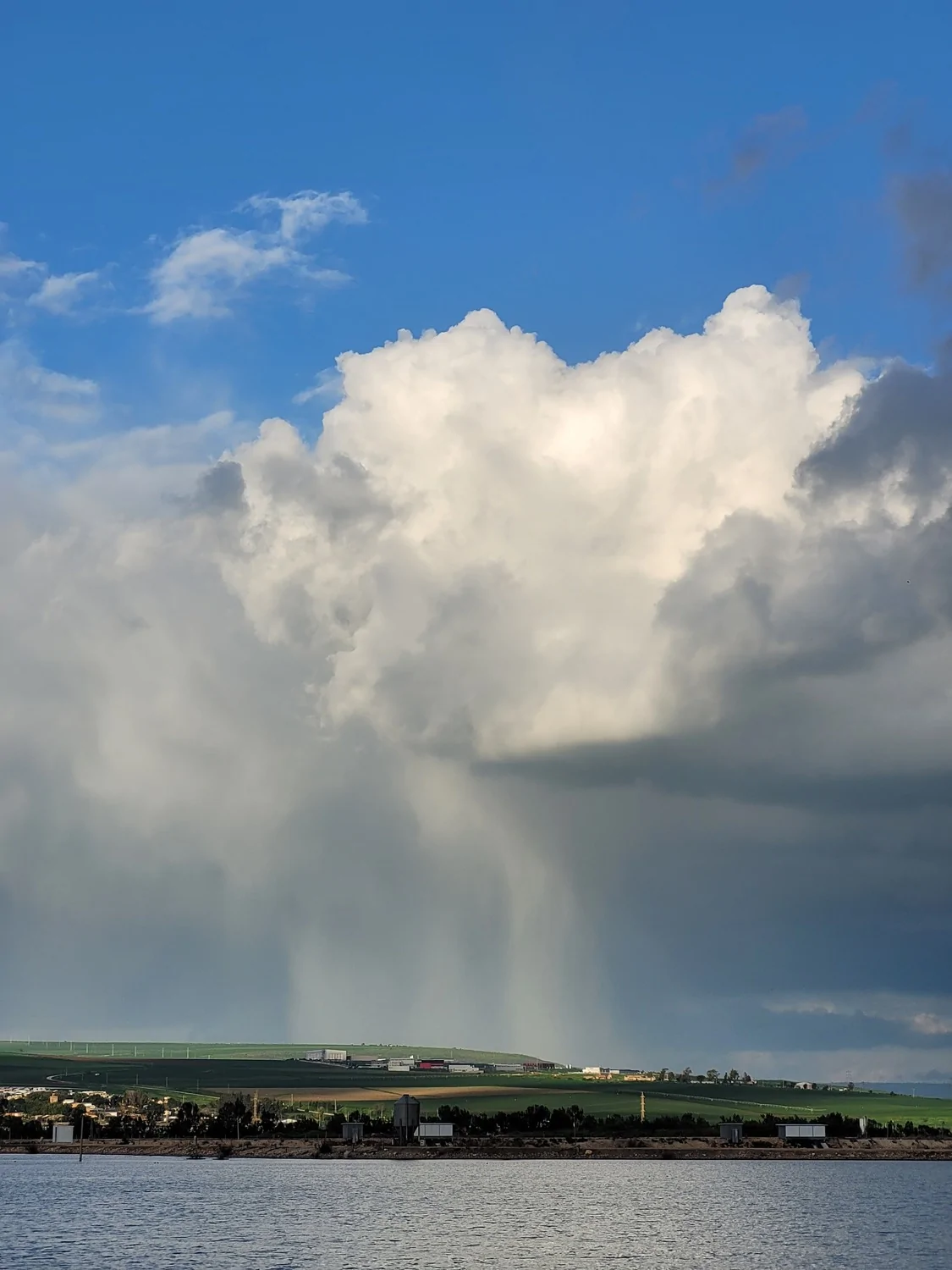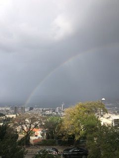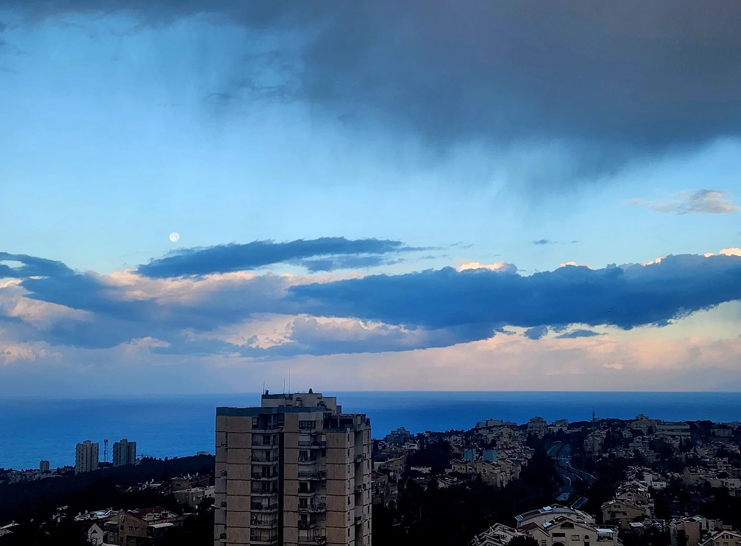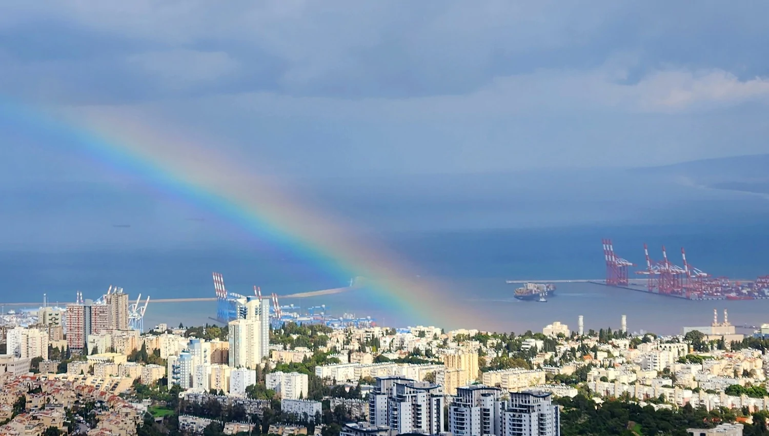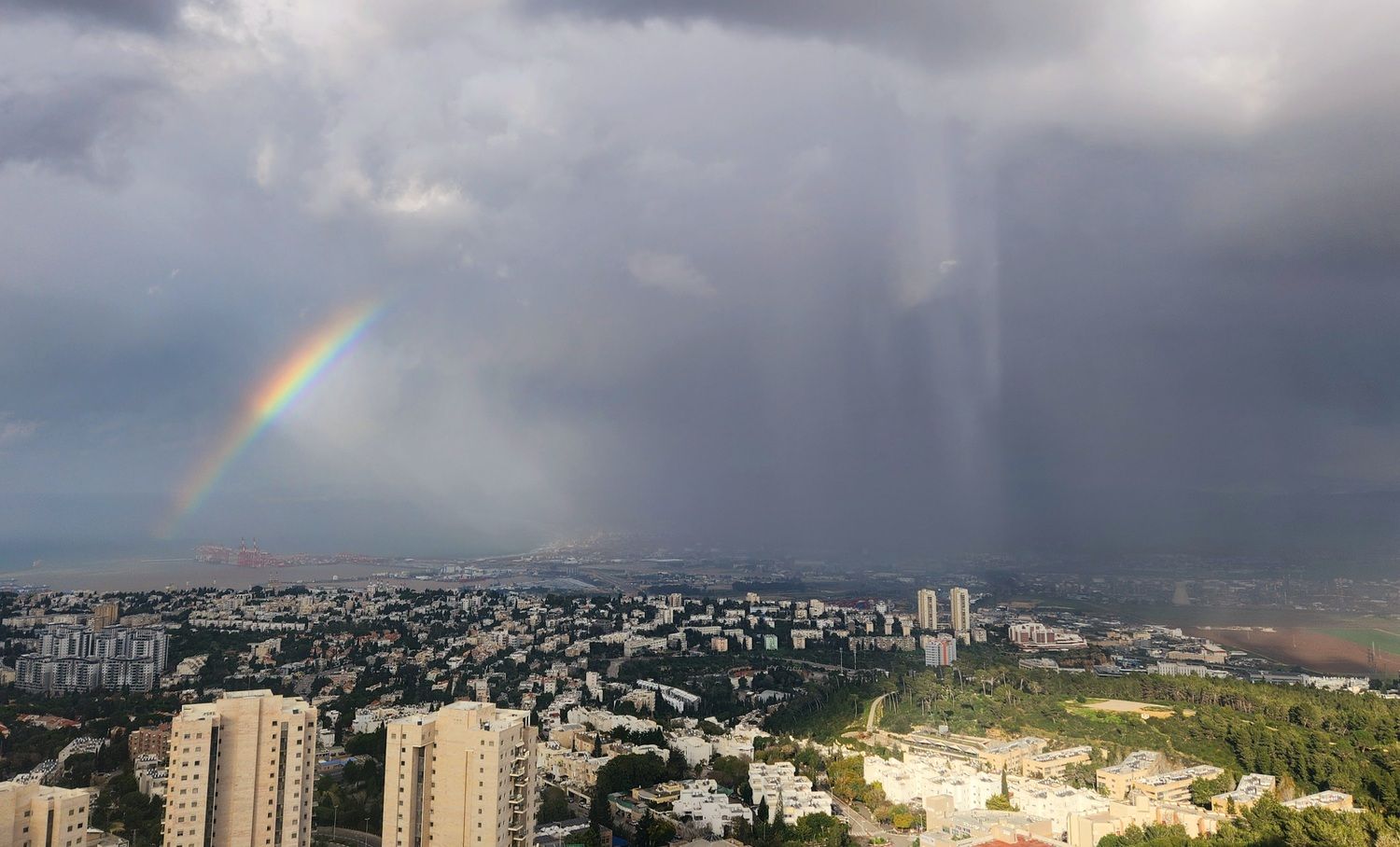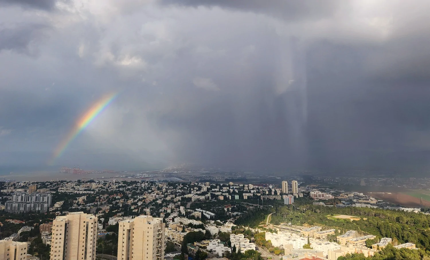 - מראה דרמטי בשמי מפרץ חיפה : מטחי גשם וקשת מונט