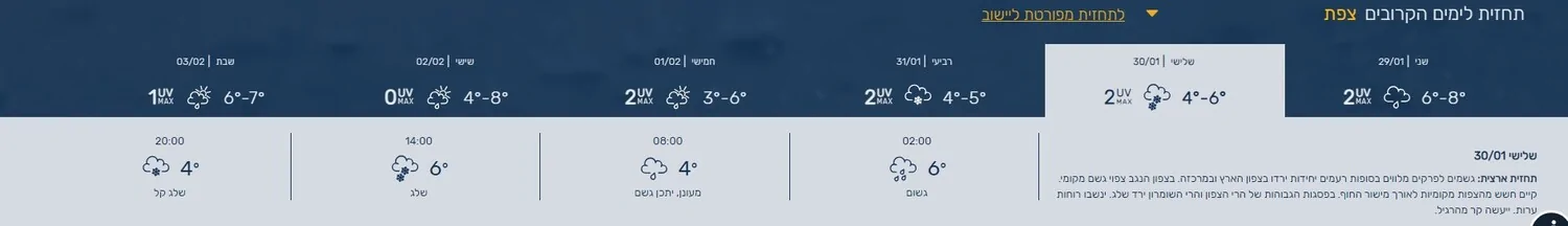 השירות המטורולוגי חוזה שלג בצפת בשלישי לילה, רביעי בוקר,