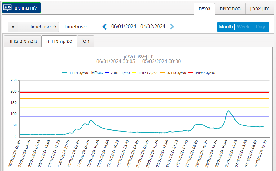 מצורף גרף הספיקה בגשר הפקק. מאמין שה Steady state (נניח כמה ספיקה תהיה עוד 2-3 ימים) יהיה באיזור ה 50מטר קוב /שנייה וזה יירד לאט מאותו רגע.