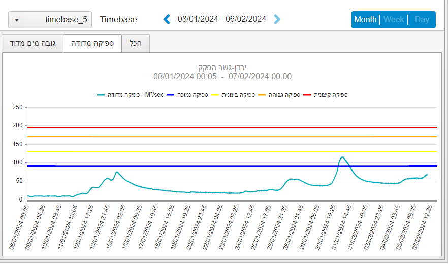 בגרף של החודש האחרון בירדן, בגשר הפקק. אפשר לראות שיש התייצבות על רמות של 43 מטר קוב/שנייה.