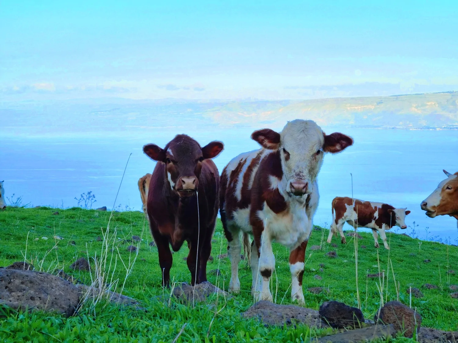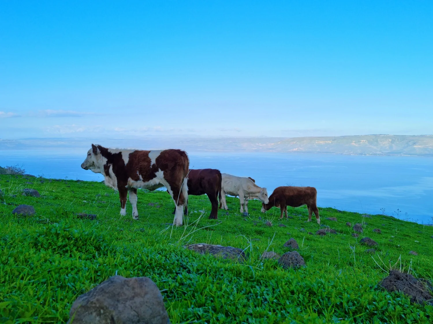 - בתמונה השלישית אפשר לראות את החרמון המושלג מעל האוזן של הפרה החומה אורי