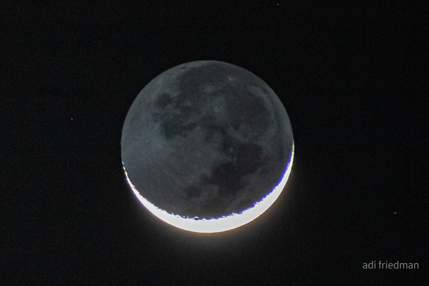 לירח יש שני מקורות אור. החלק שנראה לנו מואר הוא החלק הפונה לשמש ומקבל את אורו ממנה, ומכאן אורו החזק. אבל אם תסתכל דרך טלסקופ או שתהיה במקום חשוך לגמרי שאין בו זיהום אור תוכל להבחין שגם שאר הירח מואר במקצת וכפי שאפשר להבחין היטב בתמונה של עדי. מקור התאורה בחלק זה הפונה לכדור הארץ הוא מאור המגיע מכדור הארץ וכפי שכתב עדי.