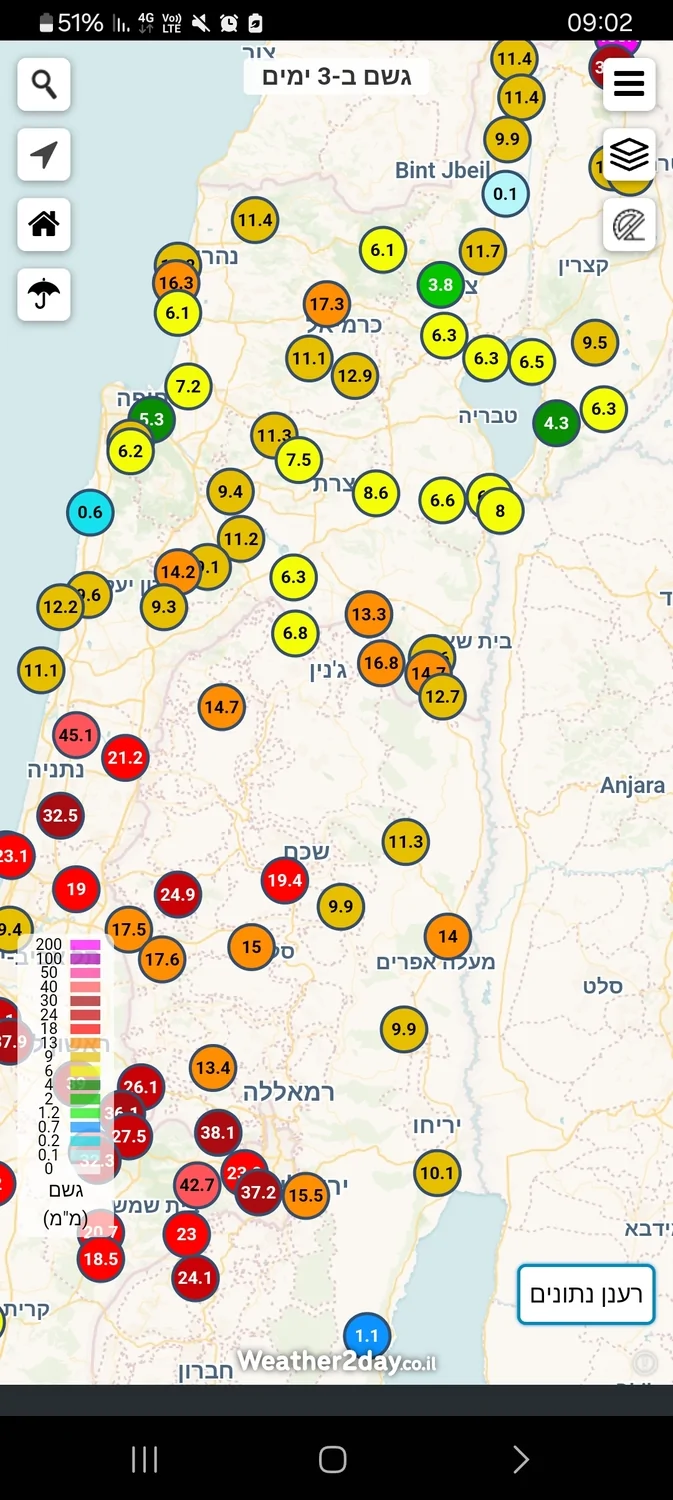 ירושלים מרכז נמדדו 34 מ"מ ליממה שהסתיימה בשמונה. מול ניות וגבעת רם שמדדו 41 ו-44 מ"מ ליממה בהתאמה. עם זאת מעניין לציין שבצובה המערבית לעיר נמדדו רק 37 מ"מ ליממה. בקיצור יש הבדלים אבל לא כאלה משמעותיים.