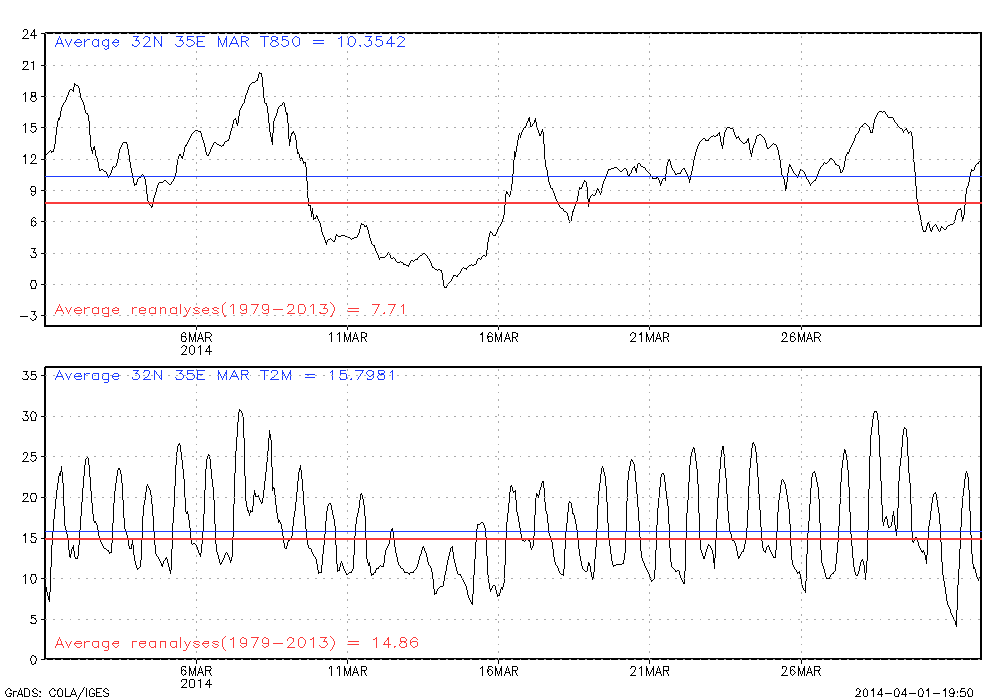 חודש מרץ במפלס 850 היה חם מהרגיל במידה ניכרת - ע"פ הנתונים ,הממוצע הרב חודשי ע"פ הרהאנליזה של MERRA הוא כ 7.71 מ"צ, ממוצע חודש מרץ 2014 הוא 10.35 מ"צ, חודש מרץ הסתיים כחם מהממוצע הרב חודשי בכ 2.64 מ"צ.
