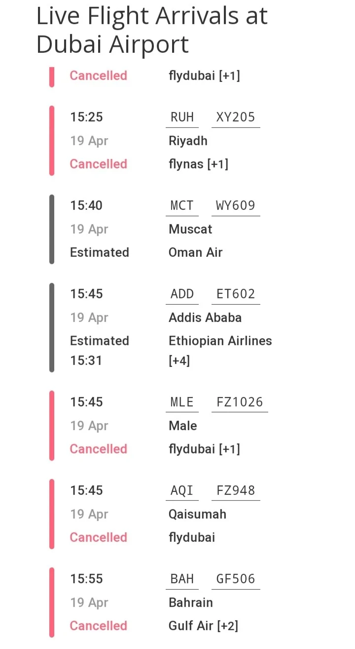 חברת התעופה הלאומית של איחוד האמירויות, אמירייטס, הודיעה הבוקר יום שישי על העצירת הצ'ק אין לכל נוסעי החברה שמגיעים לעצירת ביניים בדובאי. עד השעה 23:59. כל זה בעקבות הסופה שפקדה השבוע את איחוד האמירויות, וגרמה לביטולי טיסות בנמל התעופה הבינלאומי של דובאי ולעצירת הטיסות הנכנסות. בדובאי ירדו הגשמים החזקים ביותר מזה 75 שנה .
