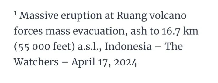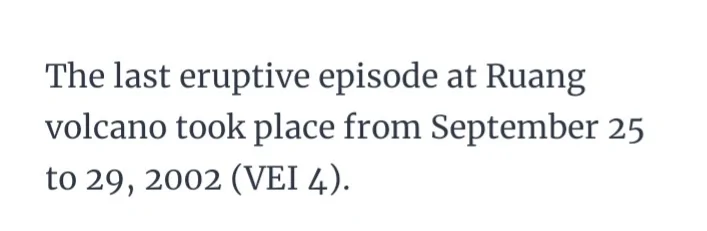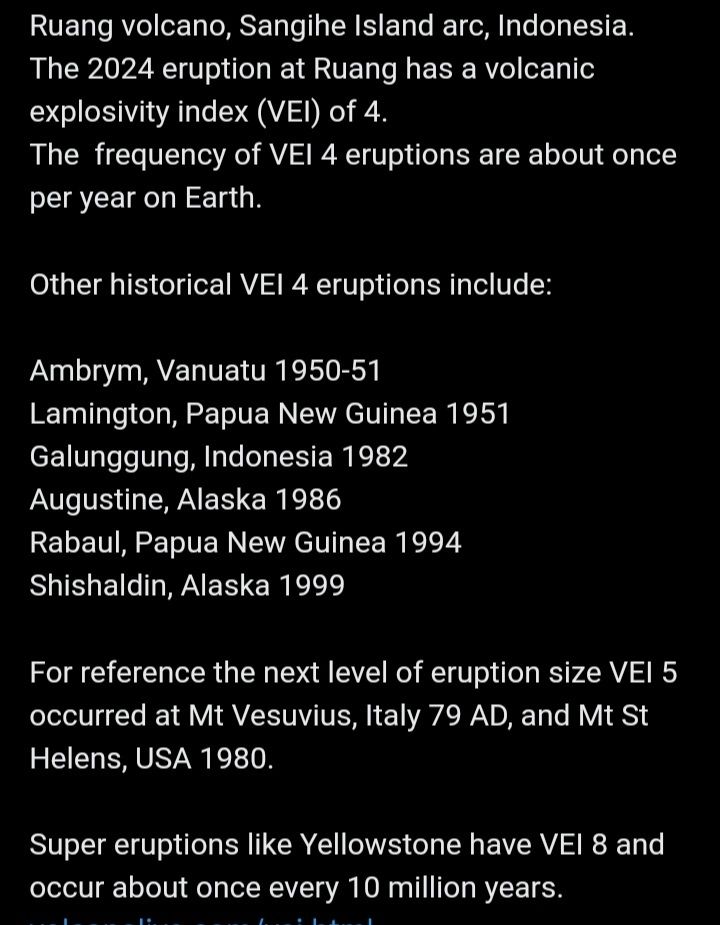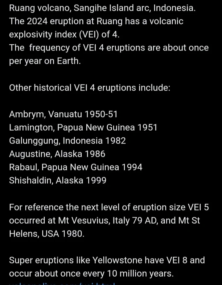 לגבי Ruang, האפר הוולקני הגיע ל-16 קמ גובה. העוצמה של ההתפרצות הקודמת לפני 22 שנה הייתה VEI 4. לגבי ההתפרצות הזו לא מצאתי הערכת עוצמה. בכל מקרה, כמו בסקאלות דומות, כל יחידה היא בגדול פי 10 יותר חזקה, מה שאומר ש-VEI 6 חזקה מ-VEI 4 בערך פי 100. בהנחה שגם התפרצות זו היא בעוצמה 4 האפקט שלה יהיה אזורי אבל לא עולמי