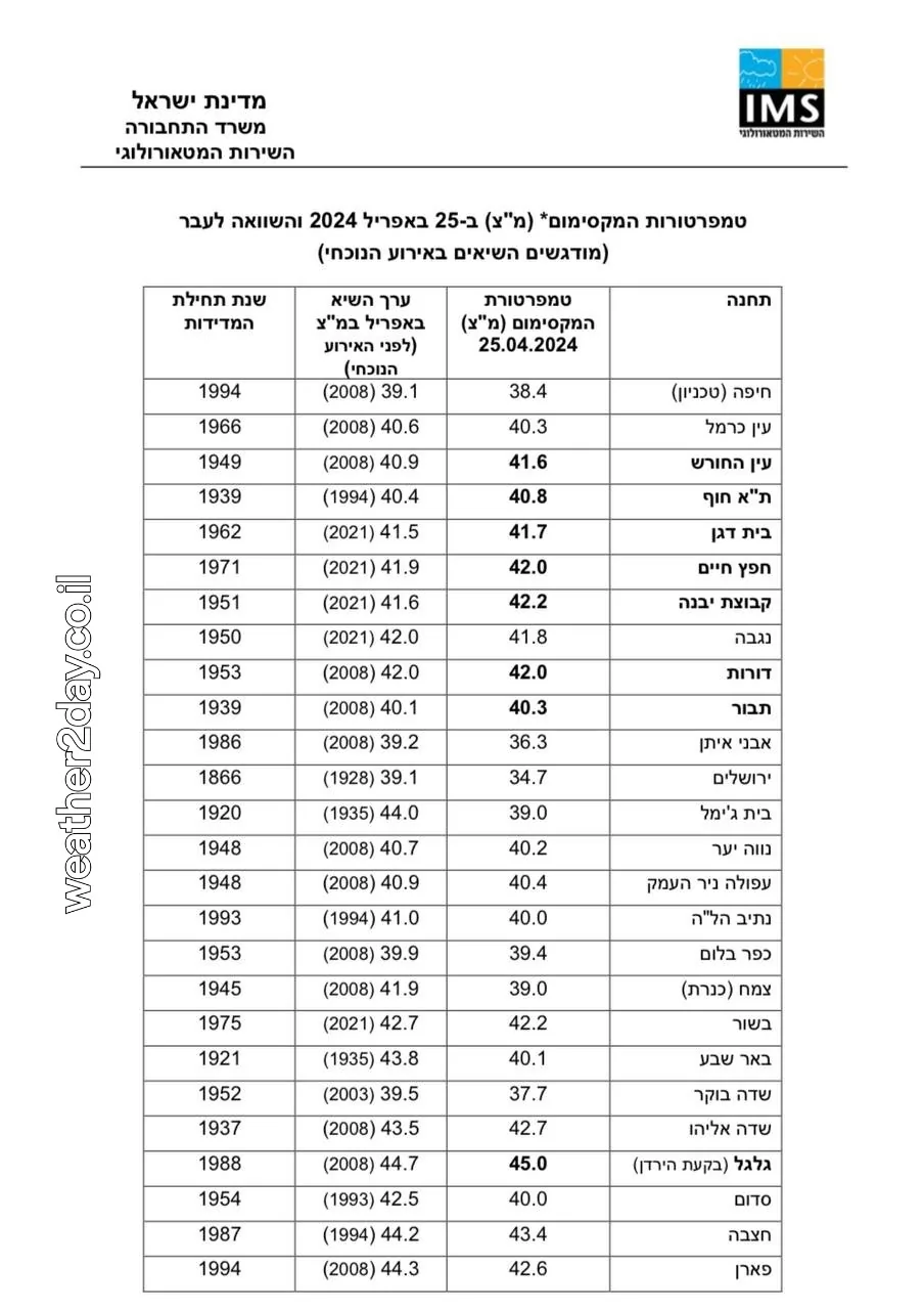 בפנים הארץ למעט הר תבור וגלגל לא נשברו השיאים לאפריל.