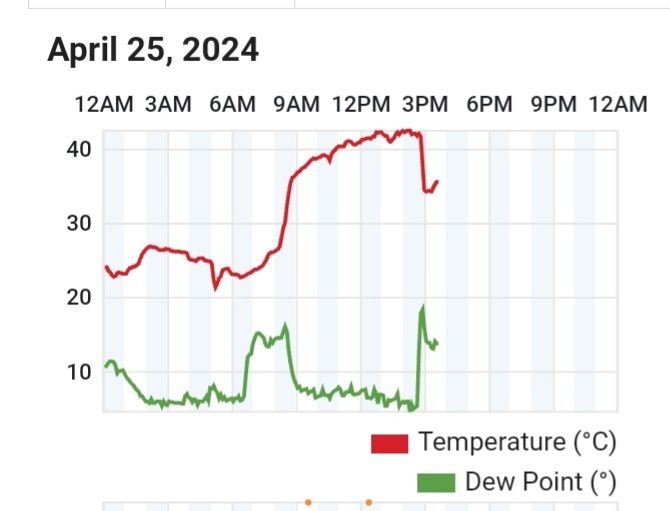 חם בחצי מעלה מאתמול. והשיא חום לאפריל זה 40.1 מעלות שהיה באפריל 2021. אגב בדכ השרבים הכבדים אצלינו זה אחרי שנה גשומה. לראשונה השנה השרבים הכבדים הם אחרי הבצורת השנה. השרב לא נדלג אבל הגשם כן דילג עלינו שאפילו ל400 שנתי לא הגענו. איזו עיר מבאסת
