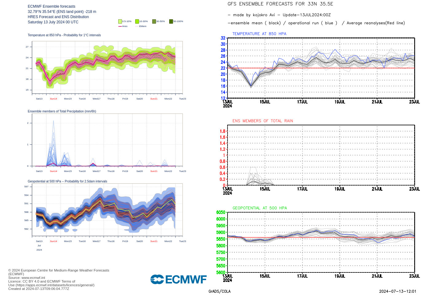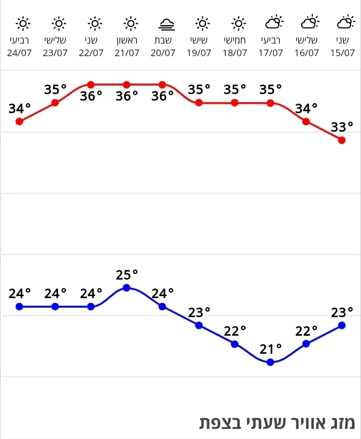 שבת ( 13.07.24) : בהיר עד מעונן חלקית, הטמפ' ירדו ויהיו סביב הממוצע לעונה, תהיה הקלה בעומסי החום ברוב האזורים. הרוח צפונית מערבית מתונה ערה עם סיכוי למשבים עזים אחה"צ.