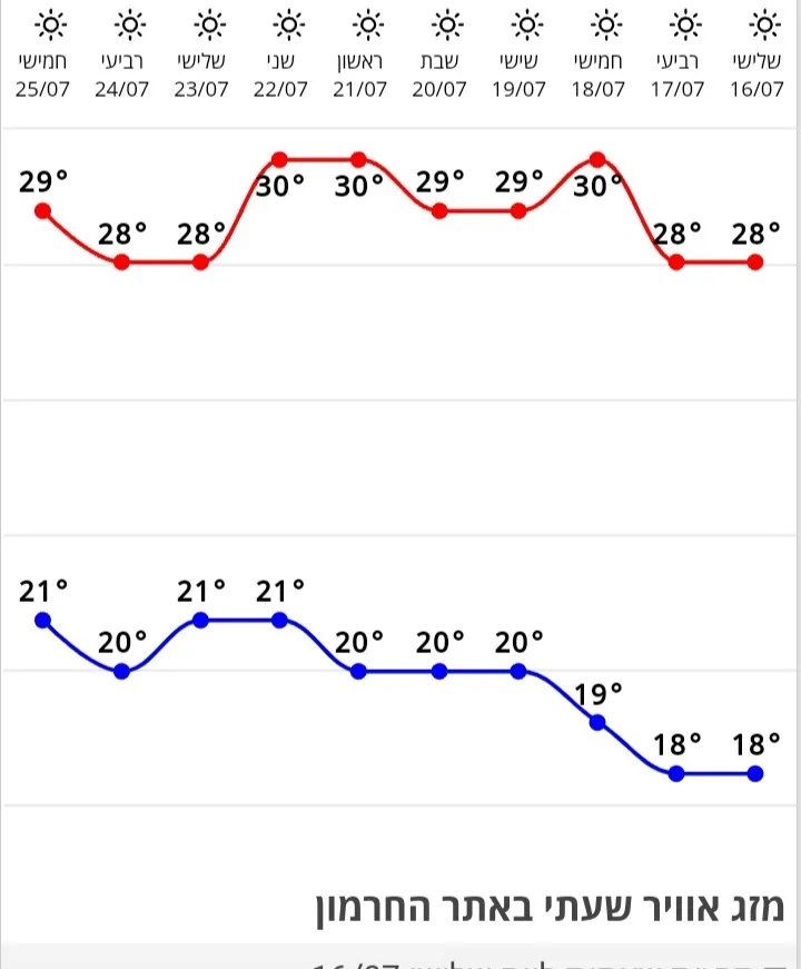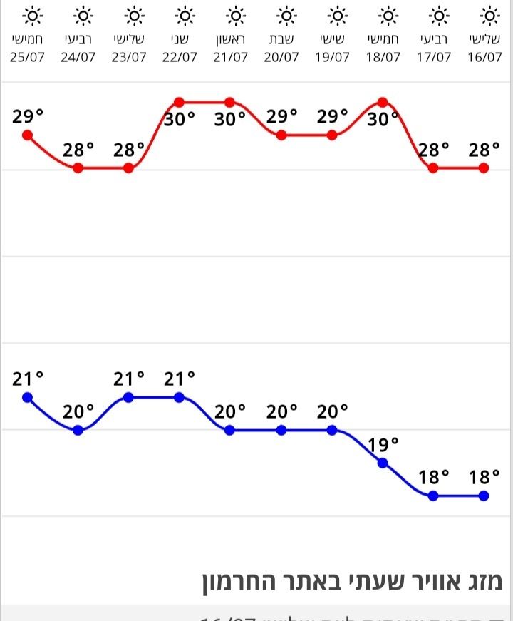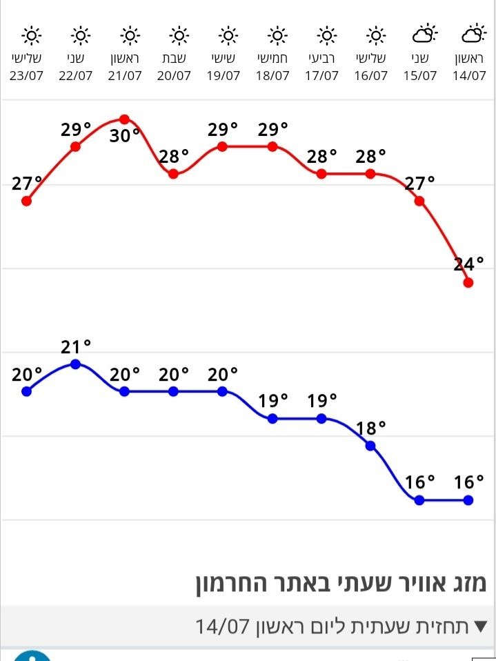 יום ראשון ( 14.07.24 ) : מעונן חלקית, הטמפ' ירדו עוד ירידה קלה ותהיה עוד הקלה בעומסי החום. הטמפ' סביב הממוצע עד מעט מתחת לזה בעיקר בהרים. במשך שעות הבוקר סיכוי לטפטוף/גשם מקומי קל מאוד בעיקר במישור החוף, לקראת הצהריים/צהריים הסיכוי עובר גם לפנים הארץ מעל ההרים בעיקר בצפון הארץ אך לא מין הנמנע גם בשדרת ההר במרכזית. הרוח דרום מערבית עד מערבית מתונה עד ערה עם אפשרות למשבים עזים.