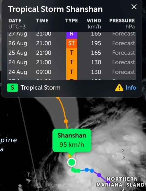 בשלב זה הסערה מוגדרת כסערה טרופית אך בהמשך שאנשאן בדרכה להכות ביפן והיא הולכת לעשות זאת בקטגוריה 3 לפי שעה עם רוחות בעוצמה של 200 קמ"ש! קיים חשש שהסופה תכה בעוצמה חזקה יותר בשל תנאי אטמוספירה חריגים באזור, זרם סילון וטמפרטורת פני ים (sst) גבוהה.