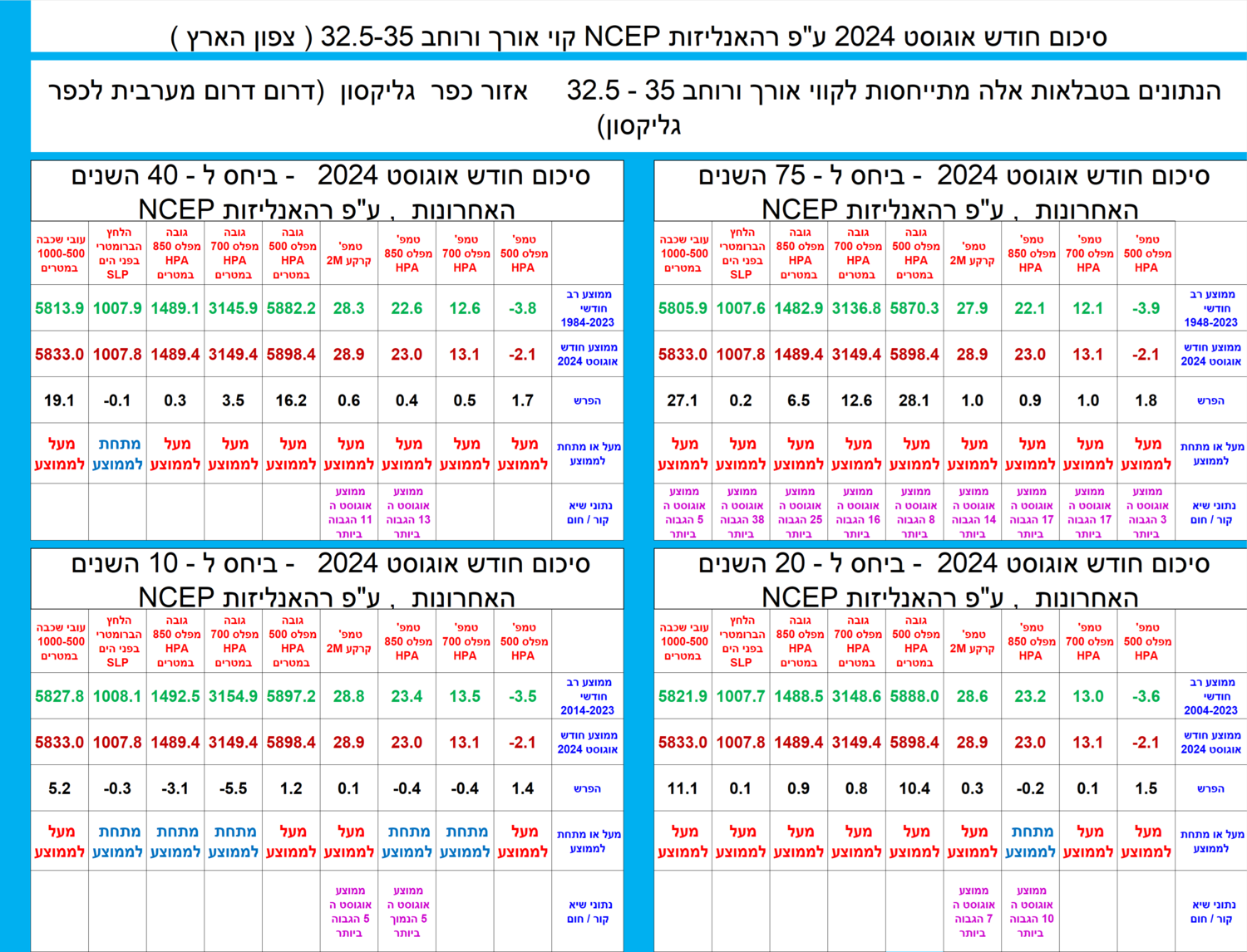 הממוצע בגובה 2 מטר מעל הקרקע בחודש אוגוסט ביחס ל 75 השנים האחרונות הסתיים כ – חם מהרגיל ב – 1 מ"צ מעל לממוצע( וזהו הממוצע ה- 14 הגבוה ביותר מתחילת המדידות מ - 1948 ) . במפלס 850 מ"ב ( גובה ממוצע 1500 מטר מעל הקרקע) חודש אוגוסט הסתיים כ – חם מהרגיל ב – 0.9 מ"צ מעל לממוצע (וזהו הממוצע ה- 17 הגבוה ביותר מתחילת המדידות מ - 1948 ). במפלס 700 מ"ב (גובה ממוצע 3000 מטר מעל הקרקע) חודש אוגוסט הסתיים כ – חם מהרגיל, ב – 1 מ"צ מעל לממוצע(וזהו הממוצע ה – 17 הגבוה ביותר מתחילת המדידות מ - 1948 ) . במפלס 500 מ"ב ( גובה ממוצע 5500 מטר מעל הקרקע ) חודש אוגוסט הסתיים כ – חם מהרגיל, ב – 1.8 מ"צ מעל לממוצע (וזהו הממוצע ה- 3 הגבוה ביותר מתחילת המדידות מ - 1948 ).