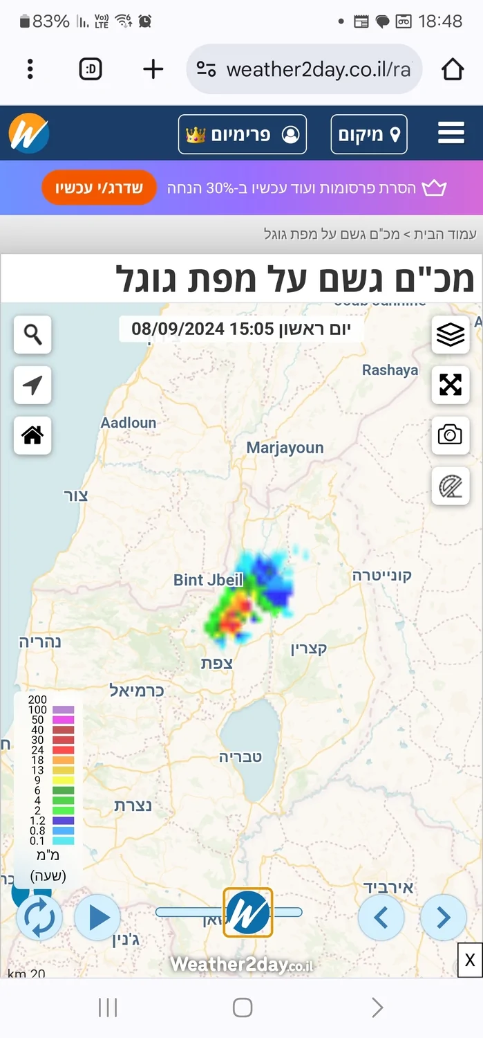 - לפי המכם ענן גשם מעל שדה אליעזר , צפונית מזרחית לצפת דובי