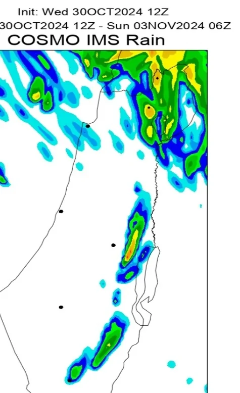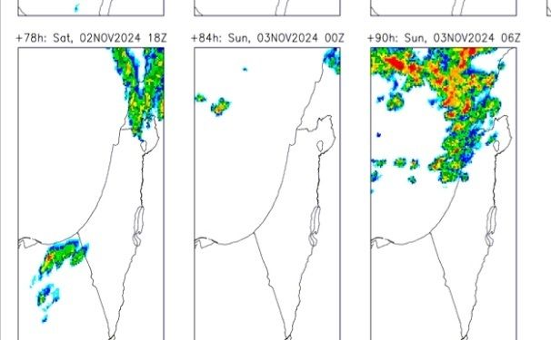 שבת ( 02.11.24 ) : מעונן חלקית עם ממטרים מקומיים מלווים סופות רעמים ויתכן אף ברד ביום זה בעיקר במזרח הארץ ובצפון, עם כי ביום זה תפרוסת הגשמים יכולה להיות יותר רחבה וגם ברחבי הארץ האחרים יתכנו גשמים מקומיים. הטמפ' ירדו ירידה קלה. הרוח משתנית מתונה עד ערה.