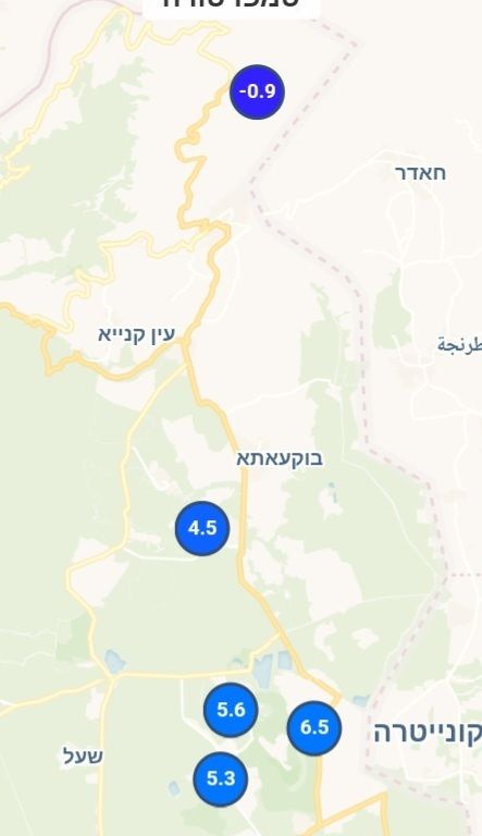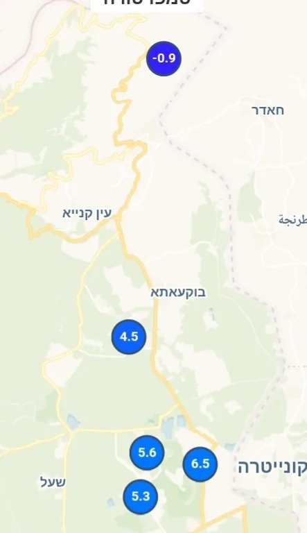 - 14:20 בצהריים: 0.8° בחרמון, 4.5° במטעי אלרום, 5.6° במרום גולן מתנאל