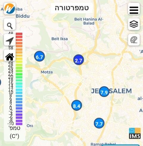 כעת קר מאוד ובהיר בירושלים. אני בהר (800+) ומאוד קר, לא יודע איך תחנות בסביבה מודדות 7-8 מעלות.