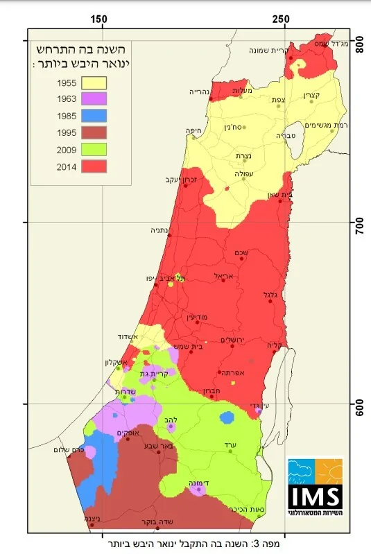 אני יודע שינואר 2014 היה הכי יבש במרכז, אבל בצפון ינואר 1955 עקף אותו. מה שכן, בשנת 1955 לא היה את כמות התחנות שיש היום, כולל כל התחנות ברמת הגולן, ולכן שיערתי לפני כמה ימים ששם יש לנו את הסיכוי הגבוה ביותר לחוות שבירות שיאיים. את 2009 ו2014 בצפון הנגב, הרי יהודה, וכלל מרכז הארץ כנראה לא ננצח. מצרף מפה שאני מאוד מחבב מהסיכום של השמ"ט לינואר 2014. מקווה שהם יעדכנו אותה, כמובן במקרה שינואר הנוכחי יהיה ראוי. יכול להיות שינואר יהיה הכי יבש בתחנה אחת או שתיים, כמו שינואר 2020 היה הכי גשום אי פעם במקווה ישראל ובעברון בלבד.