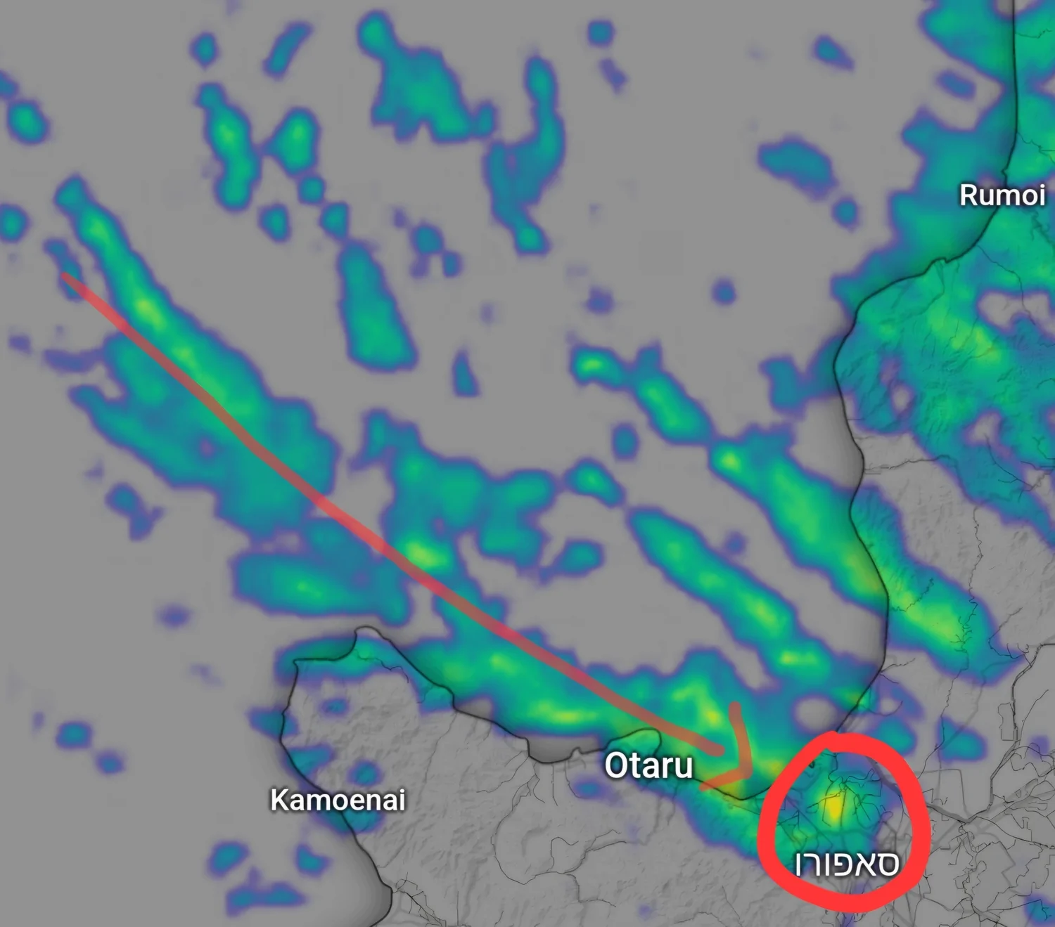 בתמונה האחרונה ניתן לראות תמונת מכ"ם עם אחת מרכבות המשקעים שהביאו עננים ממטירים שהורידו שלגים בסאפורו במשך שעות רבות.