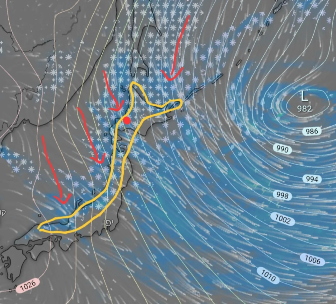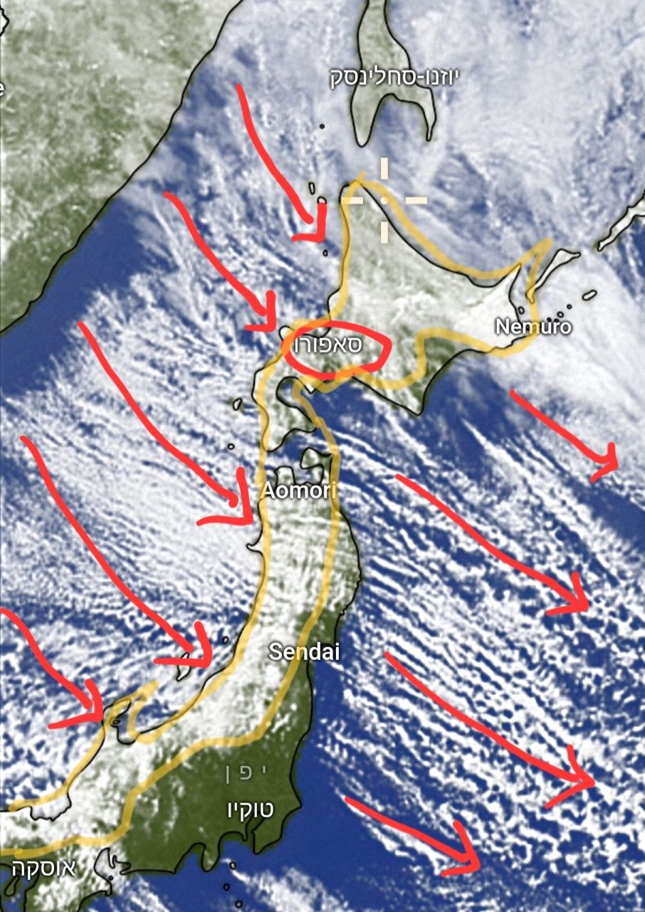 בתמונה הראשונה ניתן לראות את השקע ממזרח ואת כיוון הרוחות (מסומן בחיצים אדומים) שהגיעו למערב וצפון יפן (מסומן בכתום). העיר סאפורו מסומנת בנקודה אדומה.