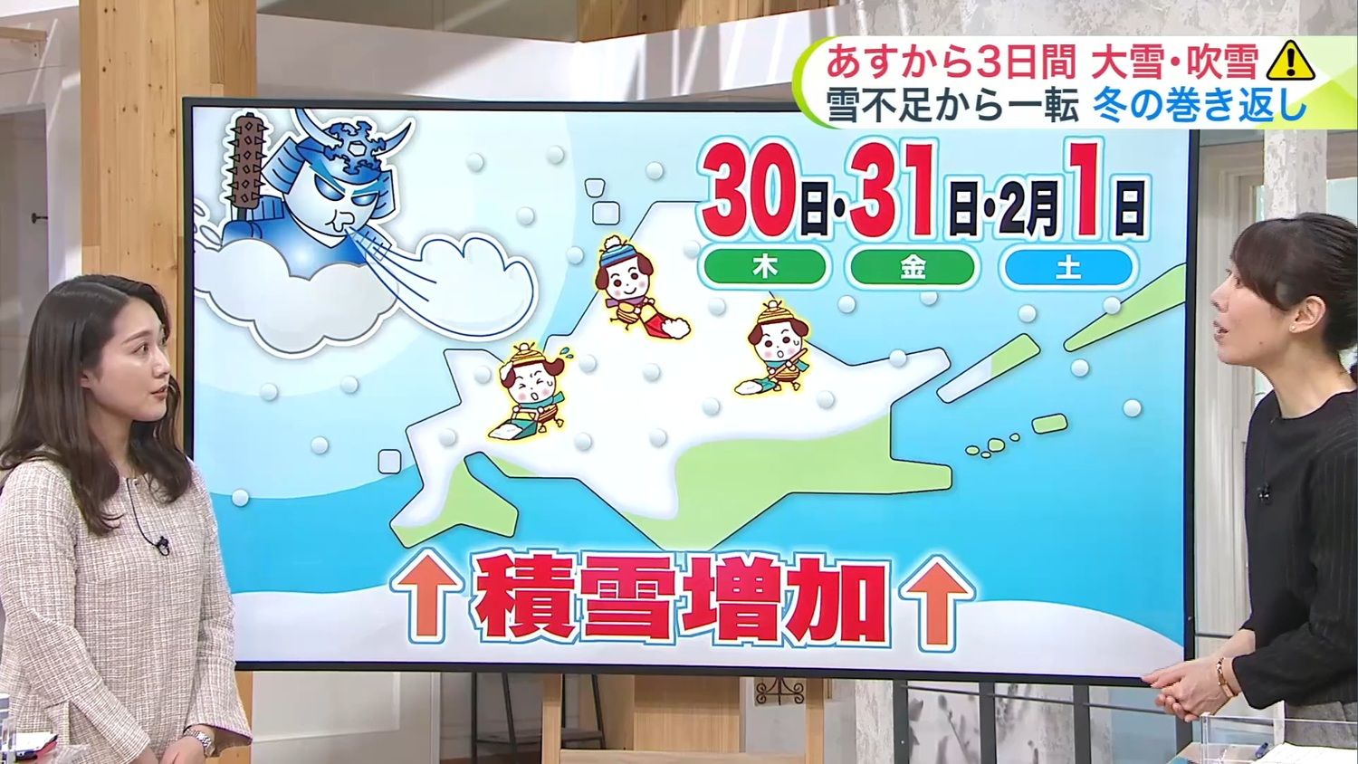 בתמונה הראשונה ניתן לראות איך הטלוויזיה היפנית הציגה באיור חמוד את גנרל חורף שעומד להביא שלגים כבדים בימים שאחרי כן (30 בינואר עד 1 בפברואר כפי שכתוב שם) לרוב הוקאידו.