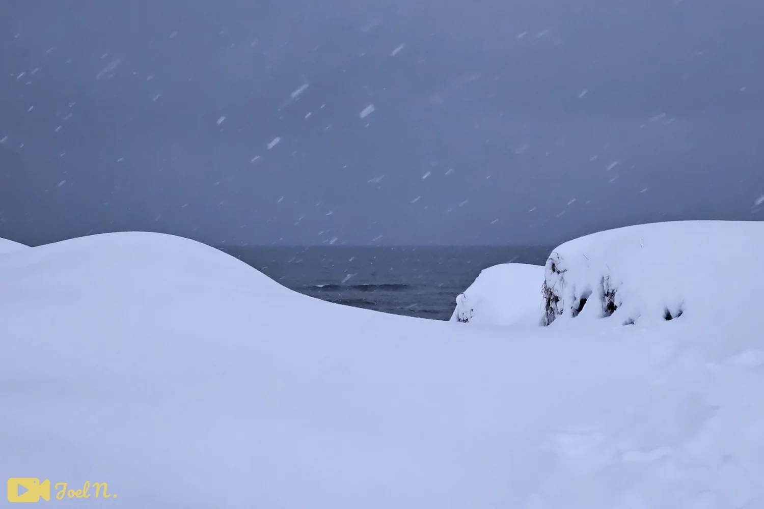 טיפסתי על הגבעות הללו כשהשלג לעתים הגיע עד לגובה הברכיים אך לאחר זמן קצר הים נחשף במלוא הדרו כשהשלגים ממשיכים לרדת. כשהגעתי לים הרגשתי כאילו אני נמצא בתוך סרט לא אמיתי. הייתי שם לחלוטין לבד באותו הזמן, בכל זאת כנראה שצריך להיות מטורף ללכת לים ביום של שלג כבד ועוד בשעה הקרובה לשקיעה, אך בתור חובב מזג אוויר וחובב קור ושלגים זאת היתה הזדמנות שהייתי חייב לנצל, בכל זאת לא כל יום חווים חוויה מטורפת שכזאת :)