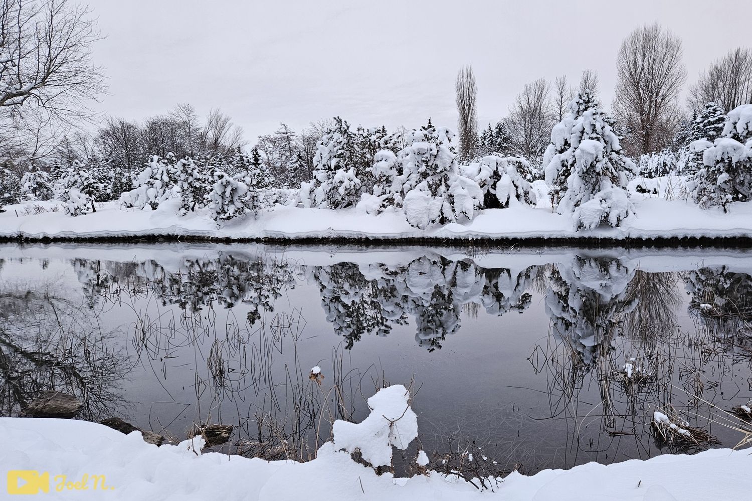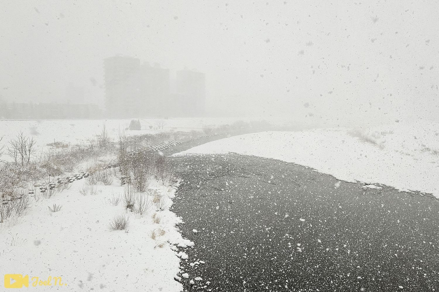 בתמונה השלישית ניתן לראות את אחד הנהרות של העיר בזמן ירידת שלג כבדה עם ראות נמוכה.